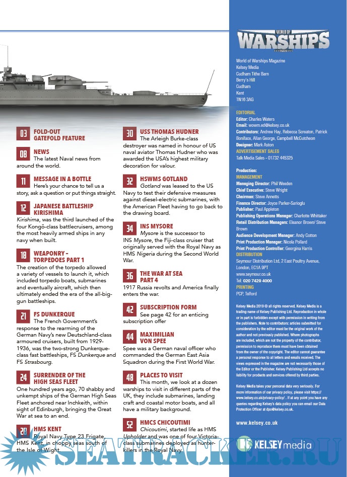 Description: This 56-page magazine will cover such battles and battleships starting with the steel-clad warships of the 1900s, up to the modern day rulers of the seas – the highly sophisticated aircraft carriers and submarines of today.We will have a Naval news section from around the world, features on famous people, conflict at sea, fascinating historical accounts and exciting places of interest that you can visit today. World of Warships will also feature some excellent naval paintings from the brushes and easels of leading Naval artists, plus superb, highly detailed, fold-out, triple gatefolds, featuring profile artworks in every issue, created by Andrew Hay.The main thrust will of course be warships, encompassing destroyers, dreadnoughts, frigates, carriers, submarines et al, and their place in global naval history.