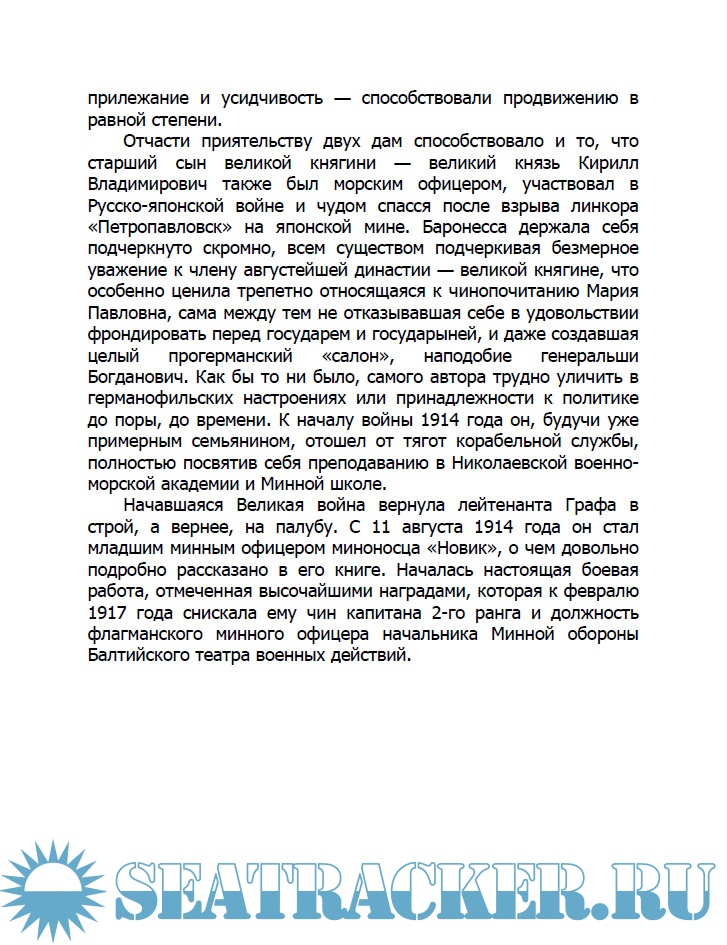 Описание: Книга Гаральда Карловича Графа (1885–1966), старшего офицера эскадренного миноносца «Новик», капитана 2-го ранга, участника Русско-японской, Первой мировой и Гражданской войн, эмигранта с 1921 года, является первой частью его большого труда – «На “Новике”. Балтийский флот в войну и революцию», изданного в Германии в 1922 году. Успех «Новика» был феноменален, тираж быстро разошелся, при этом одна часть его была вывезена в РСФСР, а другая прочно осела в частных и общественных библиотеках русской эмиграции. Книгу читали обыватели, морские офицеры канувшей в историю Российской империи, великие князья, либералы русского зарубежья, которые в жизни не имели интереса к морской службе. Читали даже преподаватели советских военных академий и работники ОГПУ по долгу службы…