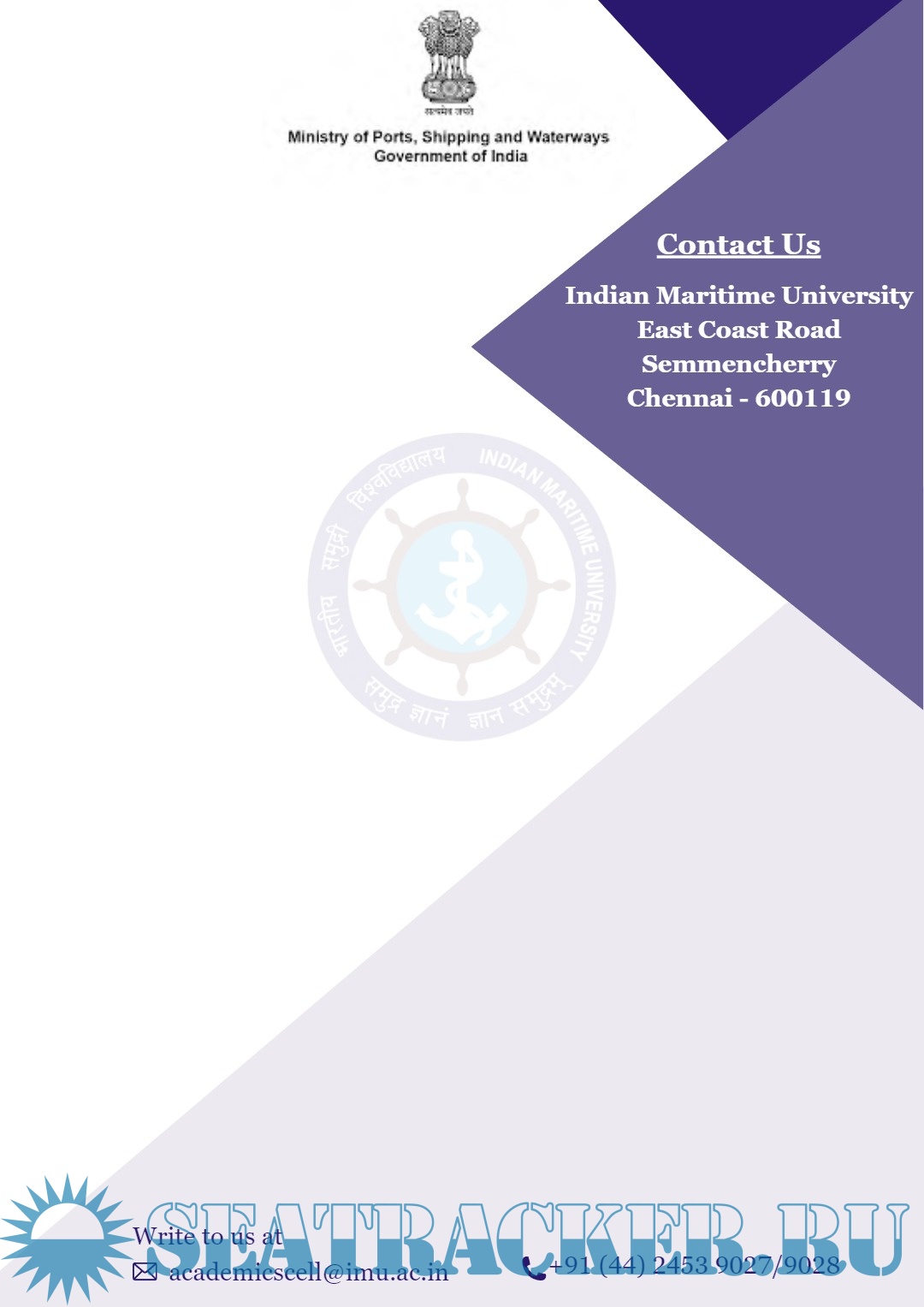Description: The Indian Maritime University (IMU) was established on 14th November 2008 as a teaching-cum-affiliating university under the aegis of the Ministry of Shipping, Government of India, with Chennai as headquarters. It was set up to promote maritime studies, training, research and extension with focus on emerging areas like oceanography, maritime history, maritime laws, maritime security, search and rescue, transportation of dangerous cargo, environmental studies and other related fields, and to achieve excellence in these areas.IMU is the apex institution in the field of Maritime Education in India. The university’s significance can be viewed from the axial role it is playing by imparting best Maritime Education and tapping best talents for the Maritime sector.IMU conducts a Common Entrance Test (IMU-CET) every year on All India basis for admissions to its courses for IMU campuses and Affiliated Institutes.