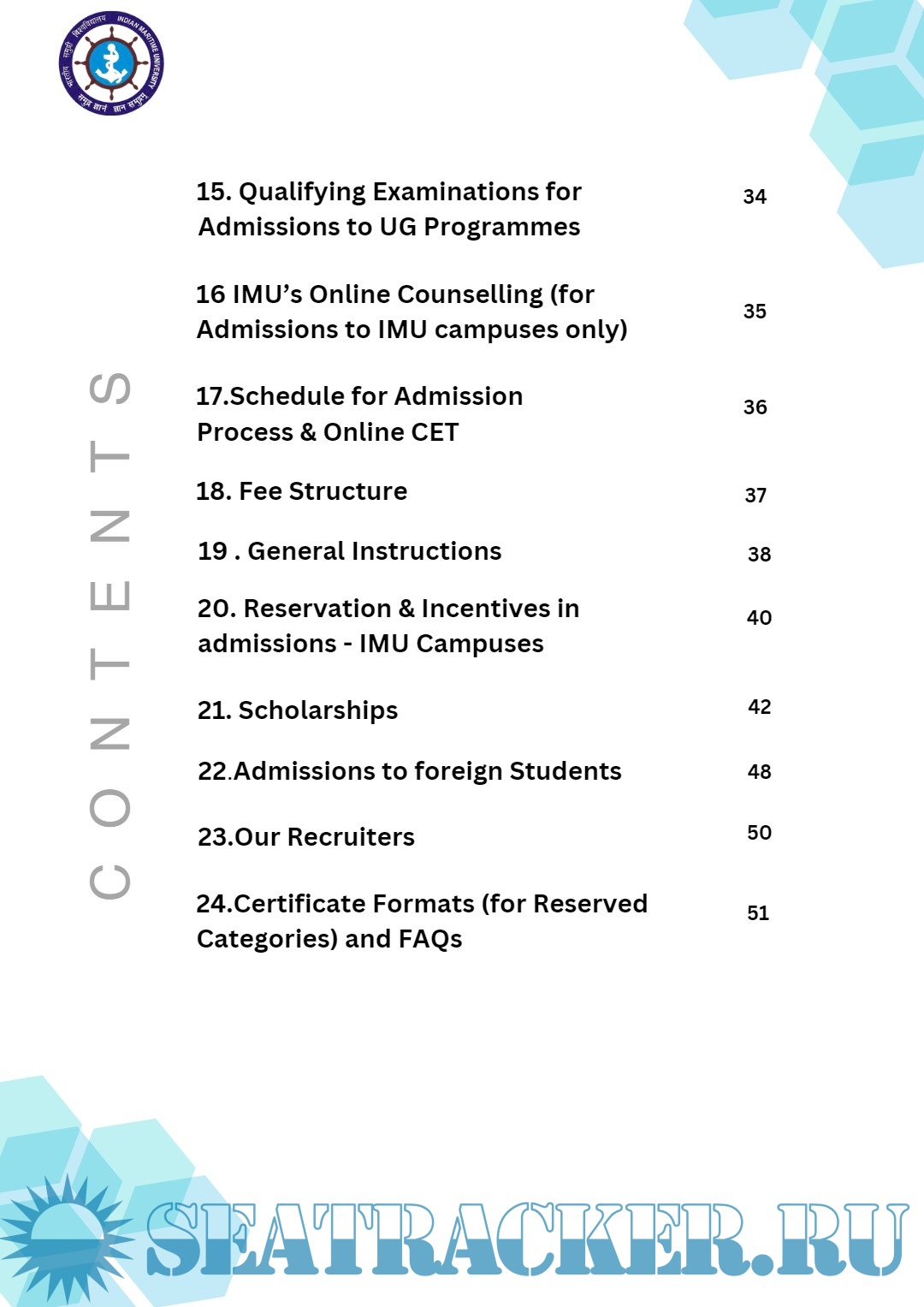 Year: 2024 Language: English Author: Indian Maritime University (IMU) Genre: Guide Format: PDF Quality: eBook Pages count: 69 Description: The Indian Maritime University (IMU) was established on 14th November 2008 as a teaching-cum-affiliating university under the aegis of the Ministry of Shipping, Government of India, with Chennai as headquarters. It was set up to promote maritime studies, training, research and extension with focus on emerging areas like oceanography, maritime history, maritime laws, maritime security, search and rescue, transportation of dangerous cargo, environmental studies and other related fields, and to achieve excellence in these areas.IMU is the apex institution in the field of Maritime Education in India. The university’s significance can be viewed from the axial role it is playing by imparting best Maritime Education and tapping best talents for the Maritime sector.IMU conducts a Common Entrance Test (IMU-CET) every year on All India basis for admissions to its courses for IMU campuses and Affiliated Institutes. Additional info: A Central University Under the Ministry of Ports, Shipping & Waterways, Government of India. Version updated on: 26.04.2024