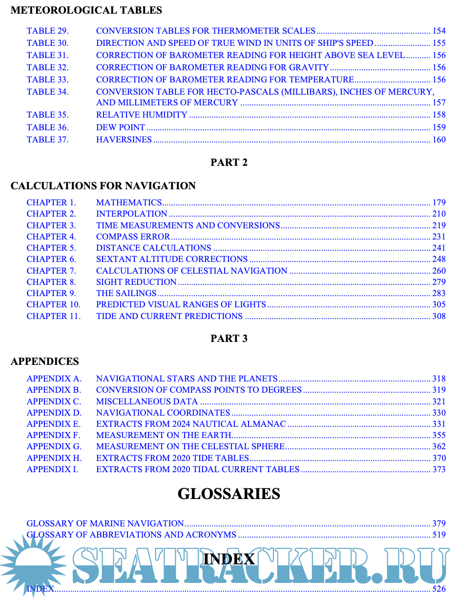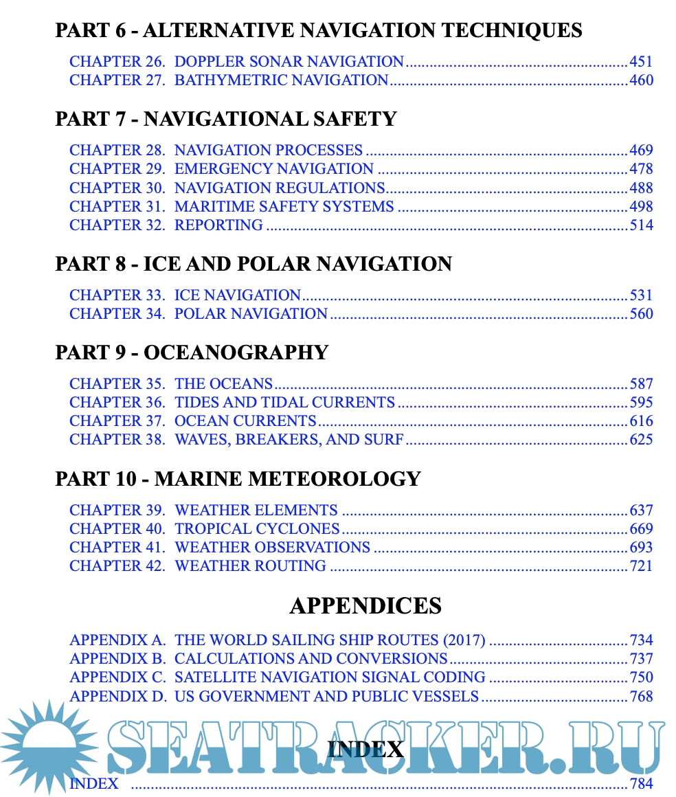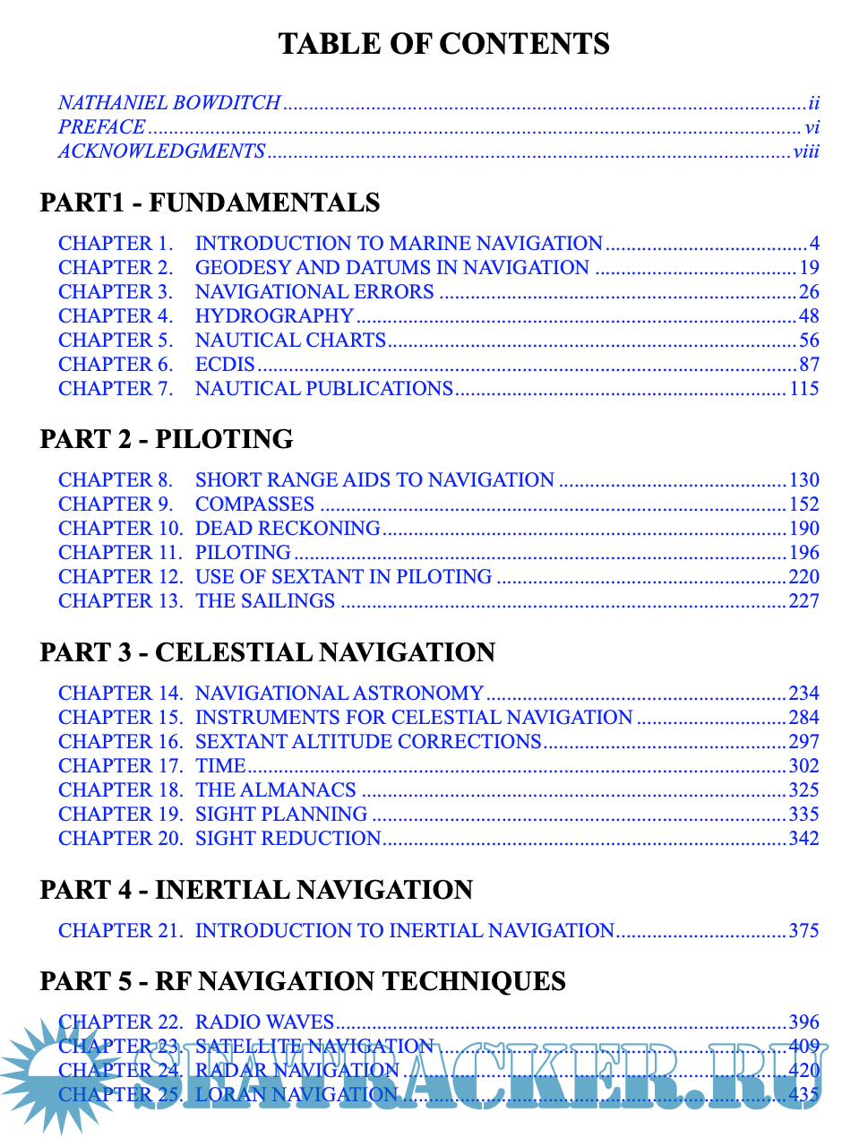 Year: 2024 Language: English Author: Nathaniel Bowdicht (Dr. Gerard J. Clifford, Jr. Editor) Genre: Handbook Publisher: NGA Edition: 2024 Format: PDF Quality: eBook Pages count: 1358 Description: As much as it is a part of history, Bowditch is not a history book. In this edition, as in past editions, dated material was dropped and new methods, technologies and tech- niques added to keep pace with changes in the practice of navigation. The changes are intended to ensure Bowditch remains the premier reference work for modern, practical marine navigation. This edition replaces but does not cancel former editions, which may be retained and consulted as to historical navigation methods not discussed herein. PART 1, FUNDAMENTALS, includes an overview of the topic of marine navigation and the organizations which develop, support and regulate it. These fundamentals include chapters relating to geodesy and chart datums; modern hydrography; the types, structure, use and limita- tions of nautical charts; electronic chart display and infor- mation systems; and finally a concise explanation and sum- mary of the various navigational publications necessary for prudent marine navigation. PART 2, PILOTING, mainly emphasizes the practical aspects of navigating a vessel in restricted waters, using both traditional and electronic methods. The closely related problems of finding the course & distance between one known point and another, and using The Sailings, are also discussed. P ART 3, CELESTIAL NA VIGA TION, reflects the renewed interest in the age old art and science of navigation by the stars, planets, moon and sun. The update recognizes the trend to over rely on GPS and electronic navigation by offering the tried and true alternative method in the event of electronic failures. P ART 4, INERTIAL NA VIGA TION, is often referred to as a sophisticated dead reckoning method. This section starts off with a discussion of gyroscopes and accelerome- ters. P ART 5, RF NA VIGA TION TECHNIQUES, explains the nature of radio waves and electronic navigation sys- tems. Chapters deal with several electronic methods of nav- igation--satellite, Loran, and Radar, with special emphasis on satellite navigation systems. PART 6, ALTERNATIVE NAVIGATION TECH- NIQUES, addresses the topic of bathymetric navigation. This comes in direct response to several Bowditch survey responses received by NGA. PART 7, NA VIGA TIONAL SAFETY , discusses recent developments in management of navigational resources, the changing role of the navigator, distress and safety communications, procedures for emergency naviga- tion, and the increasingly complex web of navigation regu- lations. PART 8, ICE AND POLAR NAVIGATION, in the Arctic is of renewed interest to the navigator as ice-free conditions allow shorter sailing distances. PART 9, OCEANOGRAPHY, has been updated to reflect the latest science and terminology. PART 10, MARINE METEOROLOGY, incorporates updated weather information and many new graphics. Additional info: Version of 2019 here in the tracker: https://seatracker.club/viewtopic.php?t=38872