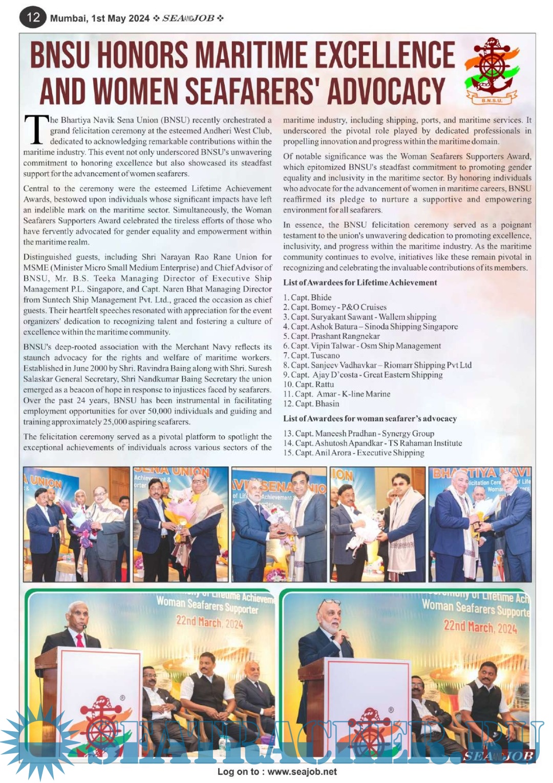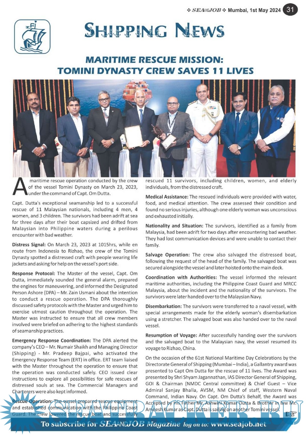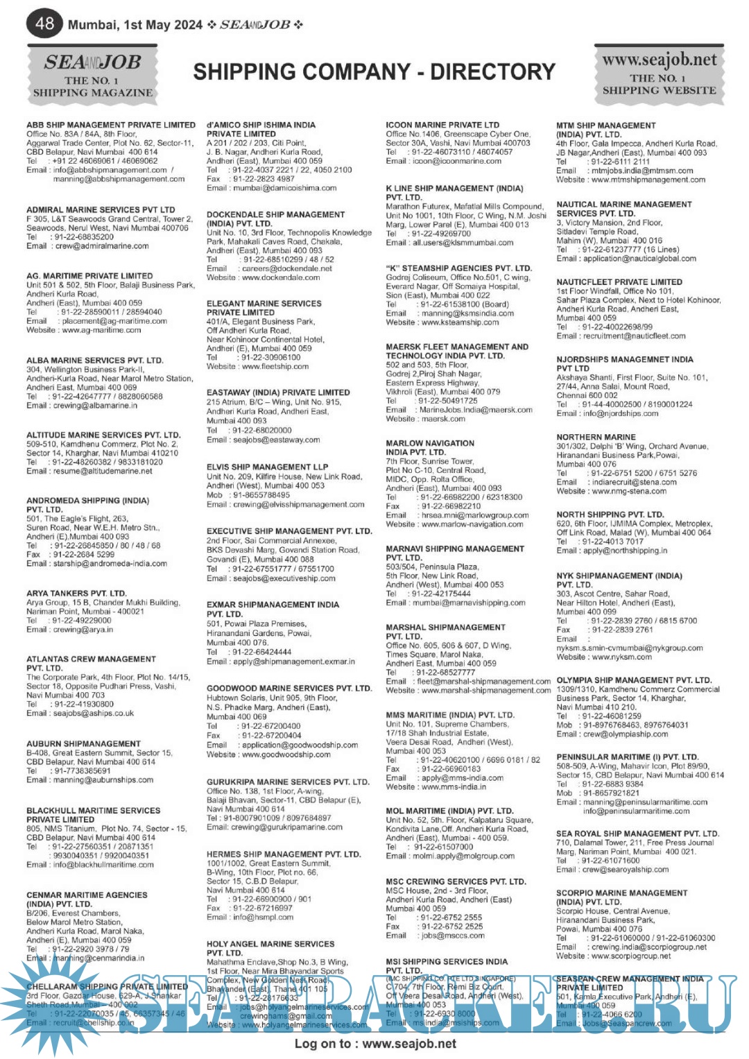Description: The Sea and Job magazine launched in May 2007, was the second venture of Sea Line Group succeeding 'seajob.net' bringing the much renowned essence to the Group, the Sea and Job Magazine quickly gained popularity, becoming the No. 1 Shipping Magazine that came to be widely circulated all over India. Sea and Job over the years has evolved as the most trusted, ethical, objective and read maritime publication that possesses a large database of subscribers from various verticals in the industry.The magazine provides informative and interesting articles covering not just the shipping world but also the world outside it.Sea and Job is also a medium for the shipping/ manning companies to advertise marine jobs and also to promote their organization by publicizing internal activities like seminars, sports events and parties.Some notable endeavors of the magazine include the Know Your Recruiter Column, the Sailing Episodes Column and the Marine Insights section. The consistent efforts and the dedication to provide extraordinary services to the industry has resulted in the magnifying popularity and patronage of Sea and Job.