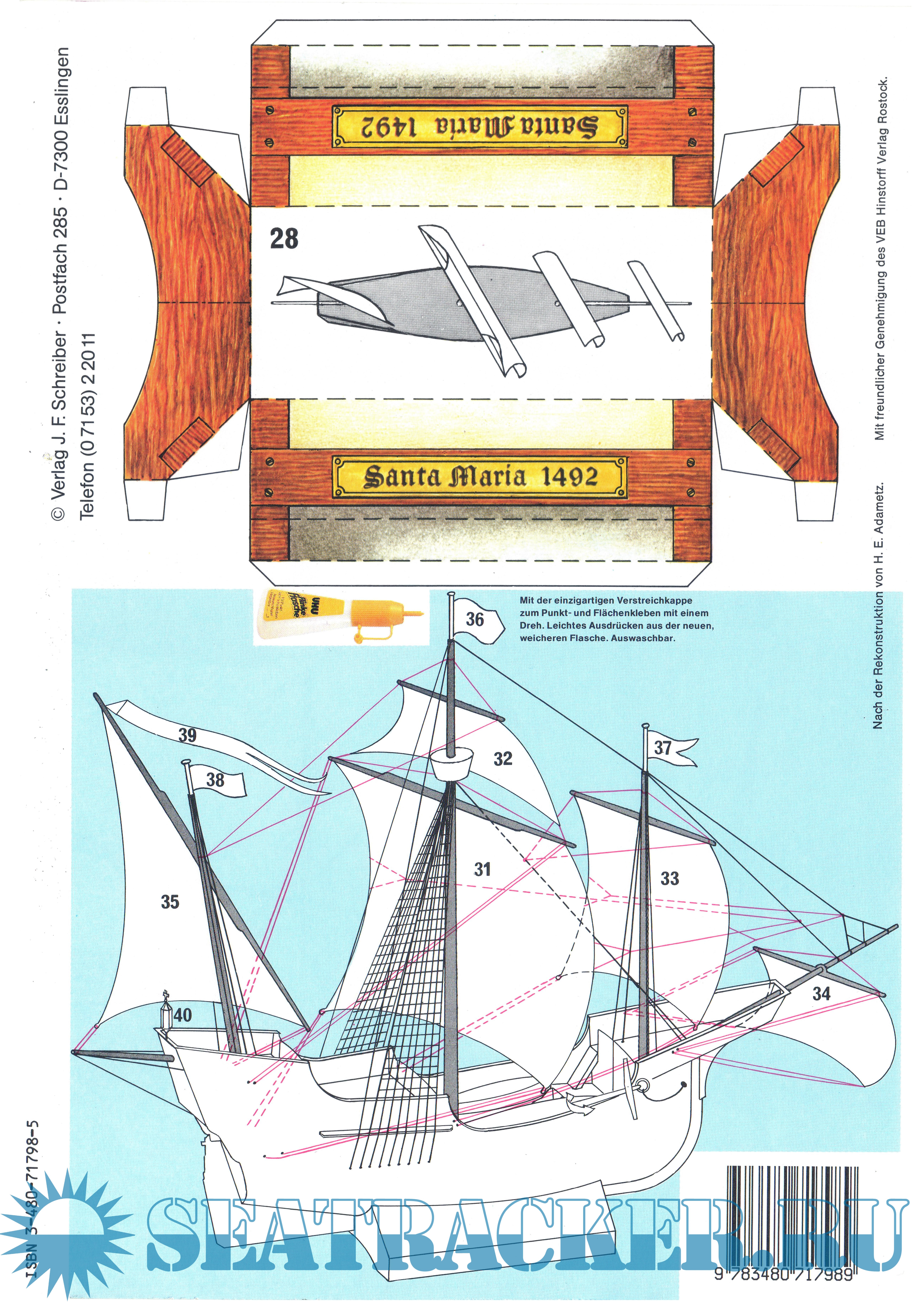 Описание: 15 листов цветных выкроек и инструкций для изготовления бумажной модели флагманского парусного корабля Колумба ''Santa Maria'' 1492 год в масштабе 1:100