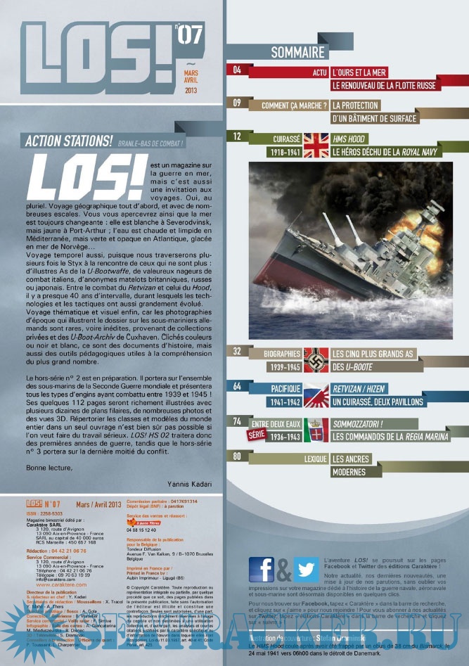 Year: 2013 Language: French Author: Collective Genre: Periodical (magazine) Format: PDF Quality: eBook Pages count: 84 Description: LES ÉDITIONS CARAKTÈRE PRENNENT LE LARGE EN LANÇANT UN NOUVEAU MAGAZINE CONSACRÉ À LA GUERRE NAVALE !Les sujets passionnants ne manquent pas et LOS ! met un point d’honneur à les présenter au lecteur comme cela n’a jamais été fait dans la presse française jusqu’à présent. Un seul mot d’ordre pour l’équipe rédactionnelle : rigueur scientifique et présentation ludique !S’appuyant sur un fond photographique d’exception, sur des plans de bateaux et d’avions, les éditions Caraktère innovent une fois de plus en vous proposant aussi des vues 3D détaillées, le tout au service de textes soigneusement rédigés par des auteurs spécialisés. Vous comprendrez ainsi comment fonctionne un submersible, comment se déroule un combat naval, comment est conçu un cuirassé ou comment attaquent les avions-torpilleurs !Revivez au fil des pages l’aventure humaine exceptionnelle des matelots de la marine marchande affrontant les U-Boote en Arctique, ou celle des pilotes embarqués sur les porte-avions américains et japonais. Lisez les exploits des hommes-grenouilles italiens en Méditerranée, des équipages des vedettes lance-torpilles dans la Manche, des sous-marins soviétiques de la guerre froide ou des grands cuirassés de 1914-18