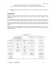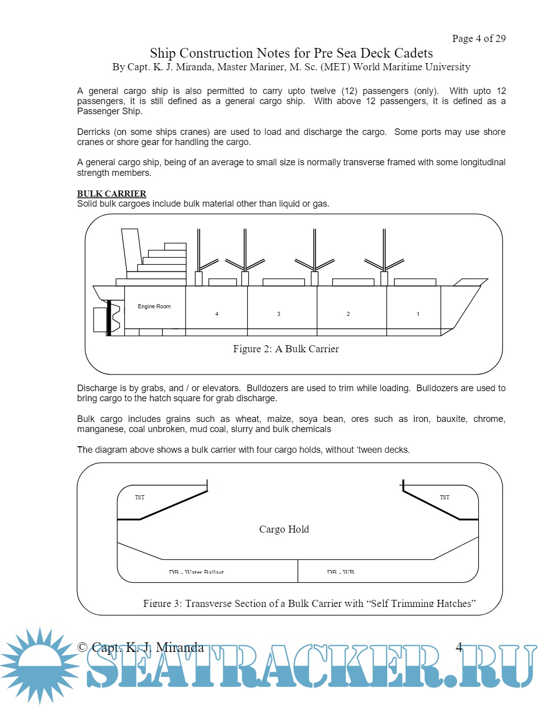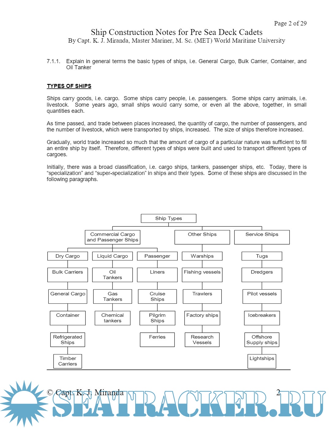 Year: 20xx Language: English Author: HP USER Publisher: Capt. K. J. Miranda Format: PDF Quality: eBook Pages count: 29 Description: Ship Construction – Syllabus (Directorate General of Shipping Guidelines) 7.1.1 Explain in general terms the basic types of ships, i.e. General Cargo, Bulk Carrier, container, and Oil Tanker. 7.1.2 Explain the principal dimension of a ship – LOA, LBP, EB, MB, MD, GT, NT. Name and explain the principal parts of a ship including peak tanks, double bottom tanks, deep tanks, cargo tanks, ballast tanks, etc. 7.1.3 Introduce the following ships plans: General Arrangement, Fire fighting appliances, life saving appliances, pumping and piping arrangements 7.1.4 Explain the following: beam, frame, bulkhead, hatch, tank, coaming, hatch cover, rudder, deck, hull, bilge, sounding pipe, air pipe, ventilator. Show where these are found on a ship. 7.1.5 Explain draft marks & load lines. Explain the method of reading draft marks in feet and metres. 7.1.6 Conduct practical exercises on reading draft by use of a suitable model. 7.1.7 Explain the causes and simple methods of prevention of corrosion in a ship’s structure. Brief notes on paint technology and anti-corrosion techniques.