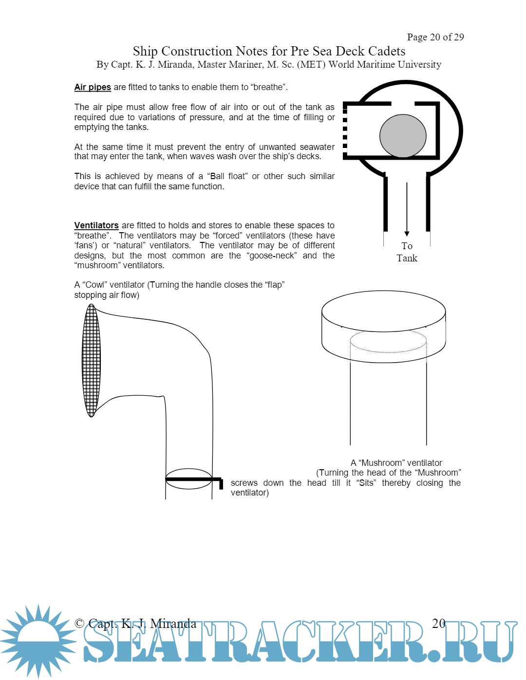 7.1.4 Explain the following: beam, frame, bulkhead, hatch, tank, coaming, hatch cover, rudder, deck, hull, bilge, sounding pipe, air pipe, ventilator. Show where these are found on a ship.