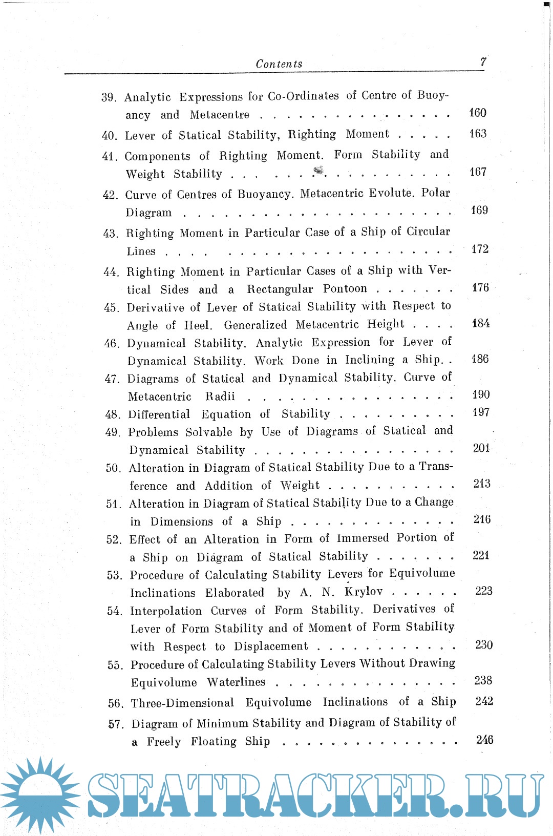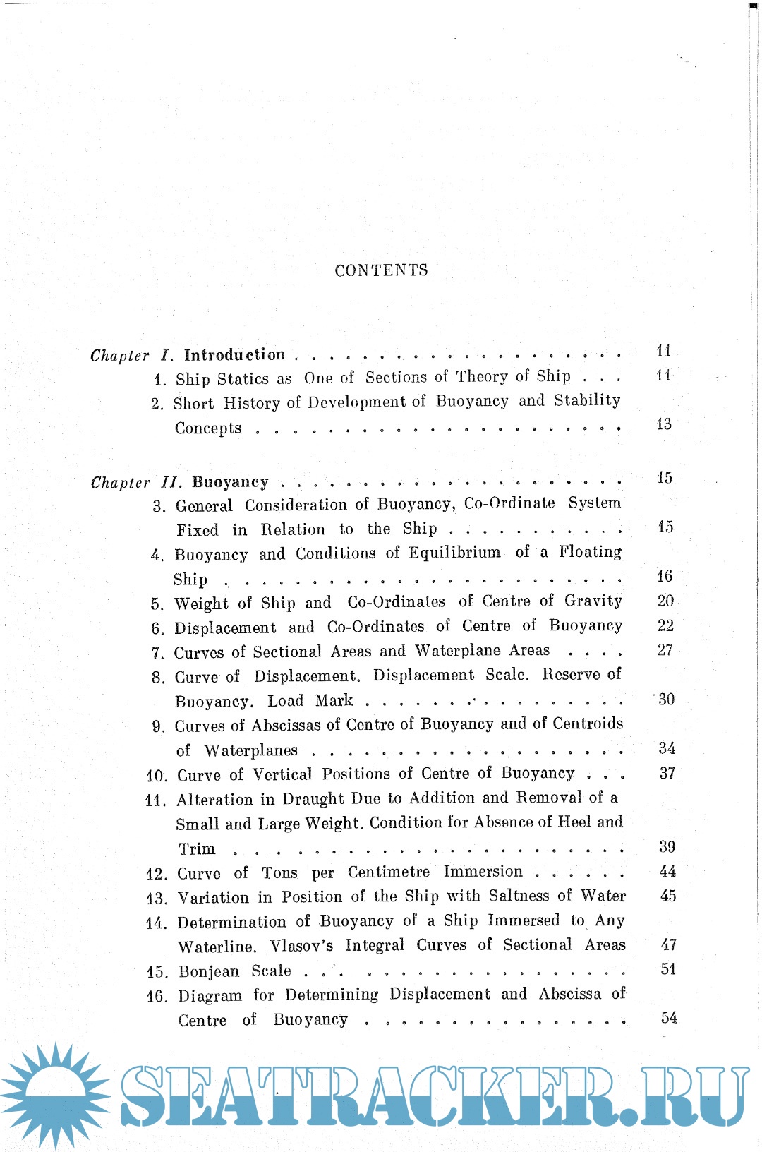 The book treats the problems concerned with the buoyancy and stability of a complete and demaged ship encountered by the naval architect in the design, building and operation of ships. It presents the theory of the subject matter and the methods of calculations employed in ship cpnstruction.