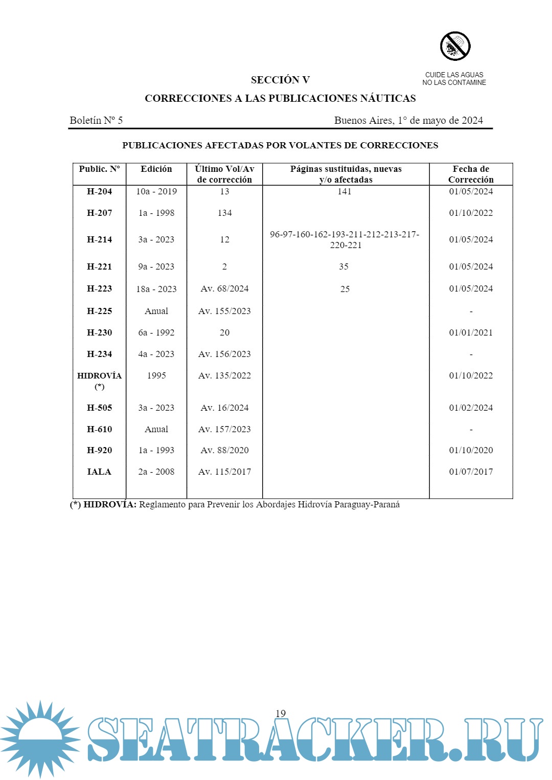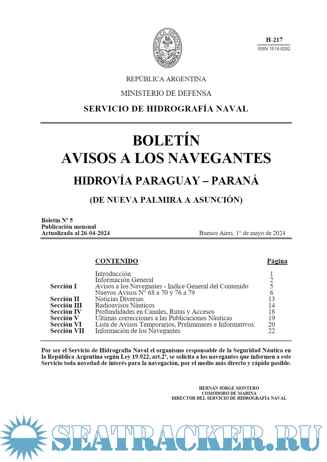 Year: 2024 Language: Spanish Author: Servicio de Hidrografía Naval Genre: Documentation Publisher: República Argentina Ministerio de Defensa Edition: Mayo 2024 Format: PDF Quality: eBook Pages count: 26 Description: El Servicio de Hidrografia Naval presta el servicio público de "Seguridad Náutica", entre otras actividades, editando desde 1998, la presente Publicación H-217 "Boletín Avisos a Los Navegantes Hidrovía Paraguay-Paraná".