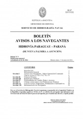 Description: El Servicio de Hidrografia Naval presta el servicio público de "Seguridad Náutica", entre otras actividades, editando desde 1998, la presente Publicación H-217 "Boletín Avisos a Los Navegantes Hidrovía Paraguay-Paraná".