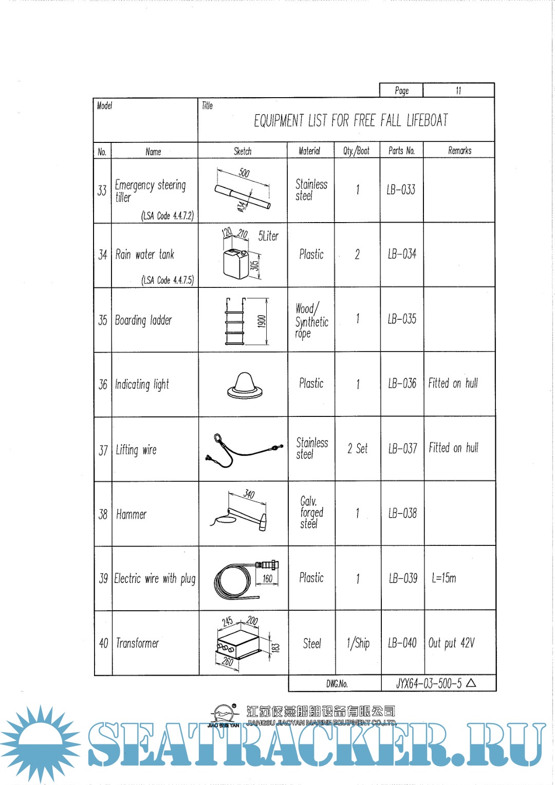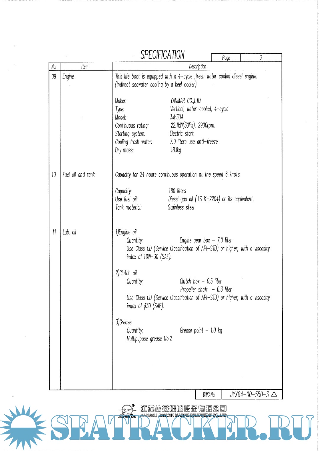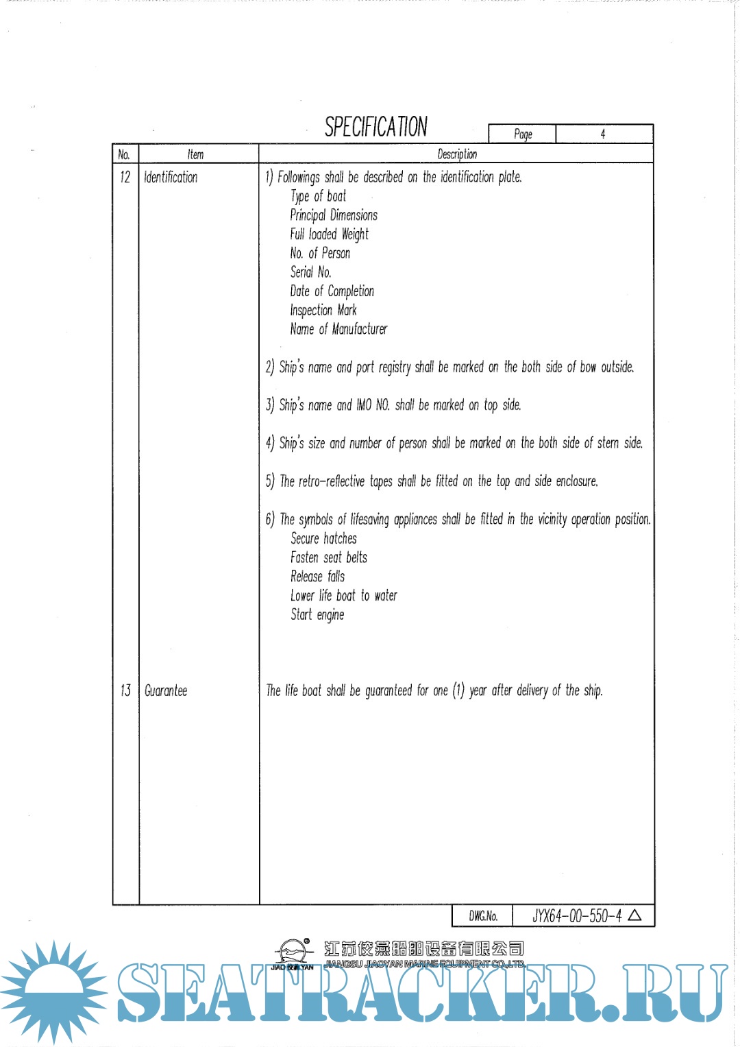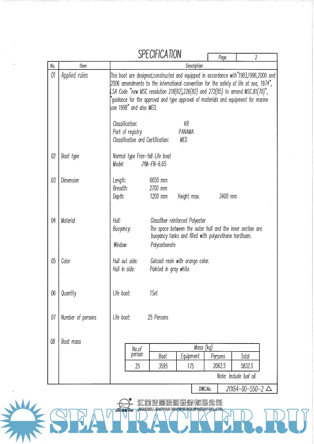 JYX64-00-550-1 JYM-FN-6.65 Normal type free-fall life boat. Instruction manual and test result of launching and recovering devices