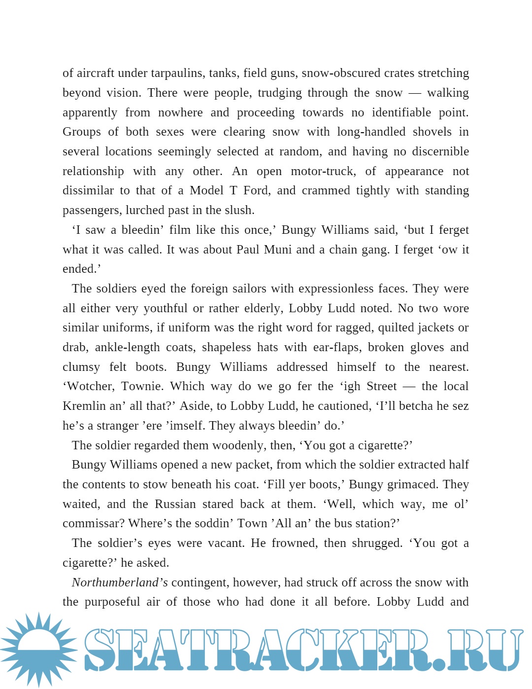 Cockney Lobby Ludd, eighteen, fighting against U-boat ""tinfish"" (torpedoes), arctic gales, and bone-weariness, hears the ribald tales and learns the tricks and techniques of survival from his salty older shipmates.