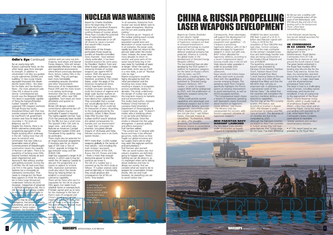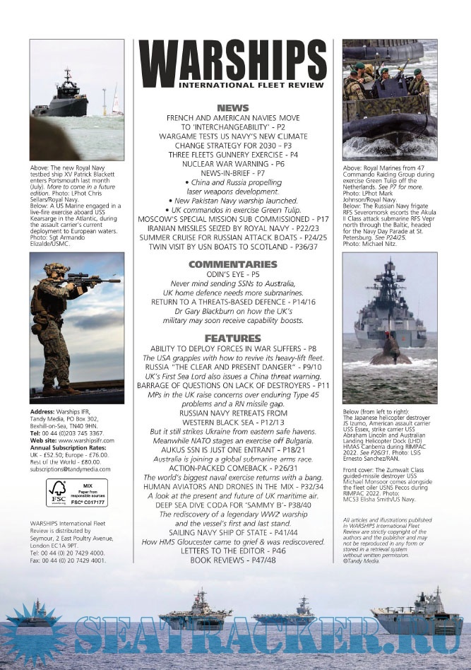 Description: Warships IFR puts the spotlight on the latest developments in the world’s navies. It covers current defence issues and has comments by leading analysts. The magazine regularly includes features on the Royal Navy and the US Navy in addition to incorporating news and features on all other navies across the globe. Warships IFR frequently carries in-depth articles on naval heritage.WARSHIPS International Fleet Review is published 12 times a year by Tandy Media Ltd who also publish Shipping Today & Yesterday (which provides news and features from the world of merchant shipping).