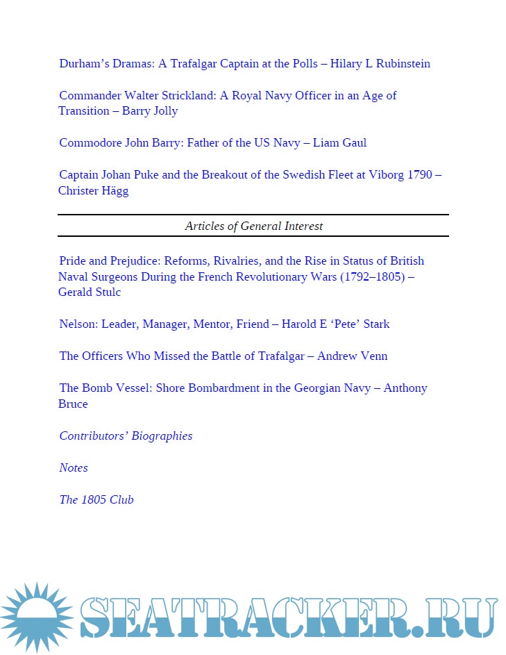 Year: 2022 Language: English Author: Sean Heuvel, Judith Pearson, John Rodgaard Genre: History Publisher: Seaforth Publishing Format: EPUB Quality: eBook Pages count: 245 Description: The Trafalgar Chronicle is the publication of choice for new research about the Georgian Navy, sometimes called ‘Nelson’s Navy’, though its scope includes all the sailing navies of the period from 1714 to 1837. The theme of the 2021 issue is ‘Georgian Navy encounters with indigenous and enslaved populations’. The theme is particularly relevant to current-day discussions and social activism occurring across the globe, that have brought new insights and perspectives to Western history of colonization, exploration, and slavery. The lead article, by 1805 Club member Tom D Fremantle, tells the story of his ancestor, Philip Gidley King, who sailed to Botany Bay with the First Fleet in 1787. becoming the first Lieutenant Governor of Norfolk Island. and the third Governor of New South Wales. His encounters with the Maoris are unforgettably touching. Another contribution reveals how the British lured slaves away from their American masters’ plantations with the promise of freedom during the War of 1812. In the tradition of recent editions, the 2021 Trafalgar Chronicle contains biographical sketches of Nelson’s contemporaries including Vice-Admiral Sir Charles Saunders, naval hero of Quebec; Sir Harry Neale, Baronet GCB, a royal favorite; and Admiral Sir Philip Durham, a Trafalgar Captain turned politician. Meanwhile, Captain Christer Hägg, RSwN Rtd regales readers with the tale of Captain Johan Puke leading the Swedish fleet in a daring breakout from the Russian blockade at Viborg in 1790. Scholars and students, experts and enthusiasts fascinated by the era of the sailing navy will be absorbed by the latest edition of this handsomely illustrated journal.