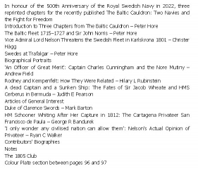 This year’s volume includes three articles on highly original topics. First, an analysis of the various swords the Duke of Clarence gave as gifts to Royal Navy officers. Second, is a deeply researched piece into early nineteenth-century court records to document the many incarnations of a Royal Navy schooner, Whiting, which, after capture by a French privateer in the War of 1812, became, herself, a privateer and a pirate ship. The last of three articles in this section gives an analysis of what Nelson thought of privateers, especially after the French xebec L’Esperance took his cutter Swift as a prize.