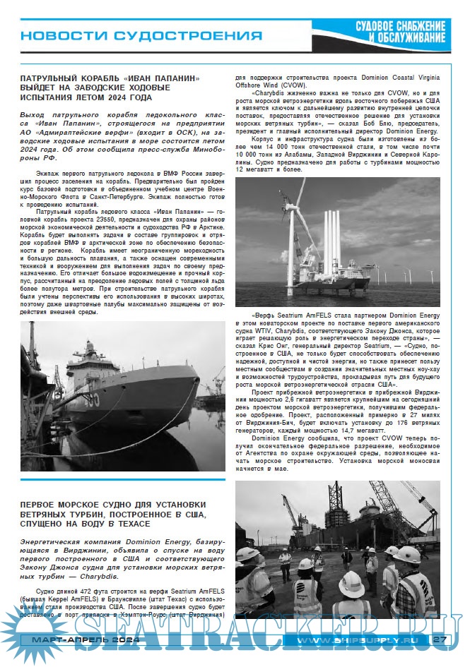 Год выпуска: 2024 Язык: Русский Автор: группа авторов Жанр: Периодическое издание (журнал) Издание: 2024-2 Формат: PDF Качество: Изначально компьютерное (eBook) Количество страниц: 56 Описание: ''Судовое снабжение и обслуживание'' периодический информационный бюллетень, издается с 1999 года и в настоящее время по праву занимает одно из ведущих мест среди специализированных отраслевых печатных изданий.Бюллетень стал надежным маркетинговым инструментом для технического менеджмента судостроительных, судоремонтных и снабженческих компаний. Более 500 отечественных и зарубежных фирм рекламодателей успешно сотрудничают с журналом с целью расширения своего бизнеса.Бесспорным преимуществом является бесплатное распространение издания целевой адресной рассылкой: судостроительным и судоремонтным предприятиям; морским и речным портам; судовладельцам морского, речного, промыслового флота; производителям и поставщикам судового оборудования, снабжения и материалов; предприятиям обслуживания флота (всего более 9000 компаний РФ). В журнале представлен весь спектр судового оборудования, комплектующих, запчастей, снабжения и материалов (с указанием контактных данных фирм производителей и поставщиков).