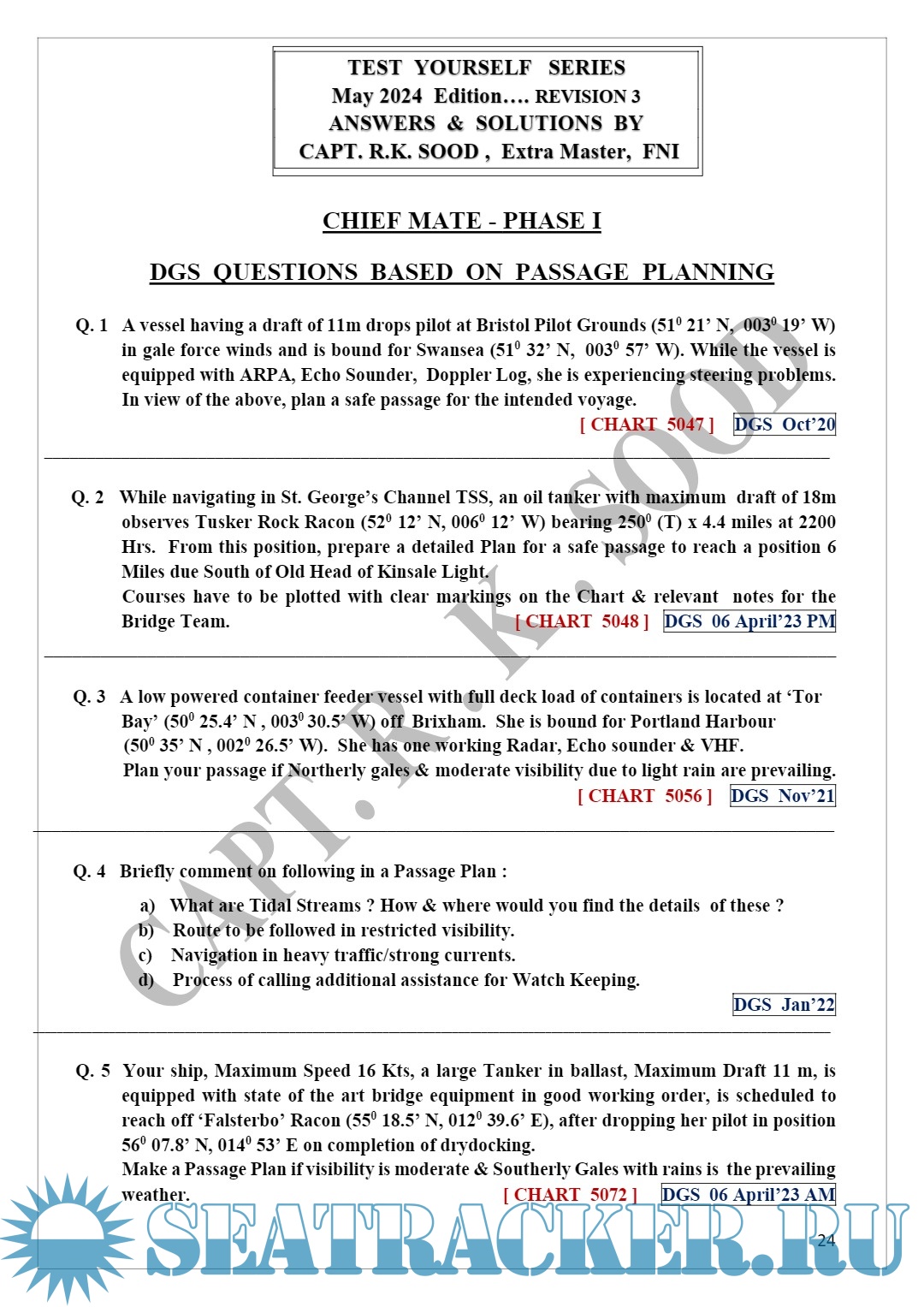 Year: 2024 Language: English Author: Capt. R.K. Sood Edition: Revision 3 | May Format: PDF Quality: eBook Pages count: 68 Description: From the author: As a starter, under ‘TEST YOURSELF SERIES’ , I have tried to venture in to the field of ‘TERRESTRIAL & CELESTIAL NAVIGATION’ (TCN) Subject of Chief Mate (F.G.) Level, notoriously considered by some to be the ‘Most Difficult Paper to Crack’ among all Subjects from Master (F.G.) down to Second Mate (F.G.) levels ! Variety of Questions, covering virtually all topics of the Subject, which have appeared in the Past DGS Examinations Papers and some my own, have been solved and ANSWERS given, so that you can check your own Competence in the subject of NAVIGATION. Please disregard the previous three editions of the same Series. A Word-of-Caution : Since I have solved CHARTWORK Questions on the Original Charts, your own Answers may differ somewhat from my own, particularly if you solve these Questions on the Photostatted Copies of Charts ! In spite of Corrections/Amendments made through three previous editions, should you still find any errors in my answers, kindly let me know. I will surely make changes after re-checking of the same. Wishing you all success in your Competency Examinations & have Safe Sailings. Additional info: About the Author: This small ‘Effort’ of mine, for the benefit of Mariners & at NO-COST to them, is dedicated to my Guruji Capt. S.S.S. Rewari, an epitome of Maritime Education & Training in India, and under whose Guidance & Encouragement, I reached this humble level of teaching the intricacies of CELESTIAL, Terrestrial & Oceanic NAVIGATION Subject, to our budding Navigators in the Merchant Navy. I have been teaching these & other Subjects to Marine Officers, in D.G.S. Approved Post-Sea Maritime Training Institutes, for the past 30 years, from the levels of second-Mates up to MASTER (Foreign Going) & beyond levels, right up to Revalidation Courses, when Officers are preparing for their COMPETENCY Examinations held by the Directorate General of Shipping, GOI and for Updating their Licenses. Earlier, I had sailed for 23 years (14 years as Master) on Foreign Going ships under the Management of ANGLO EASTERN , UNIVAN & WALLEM.