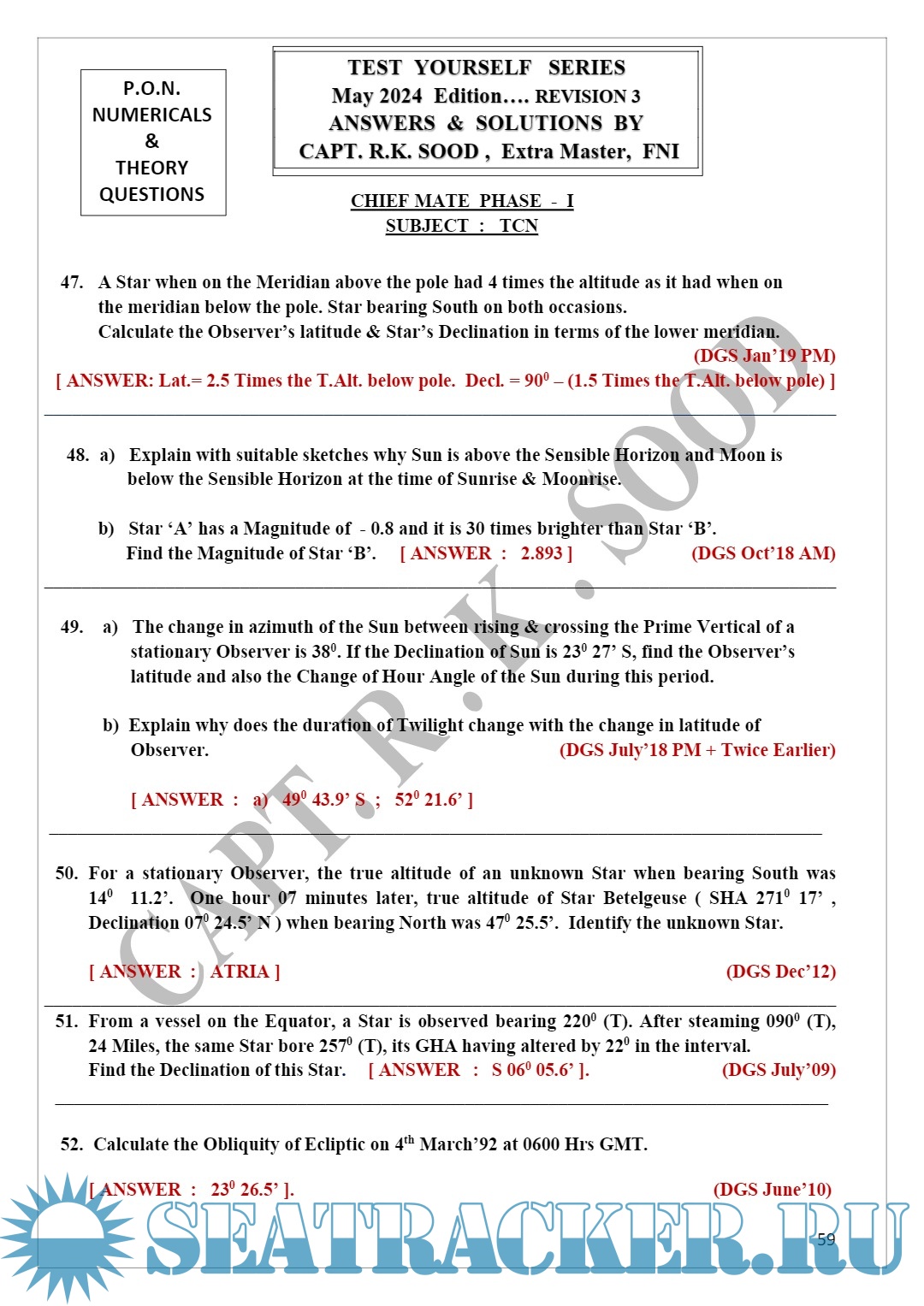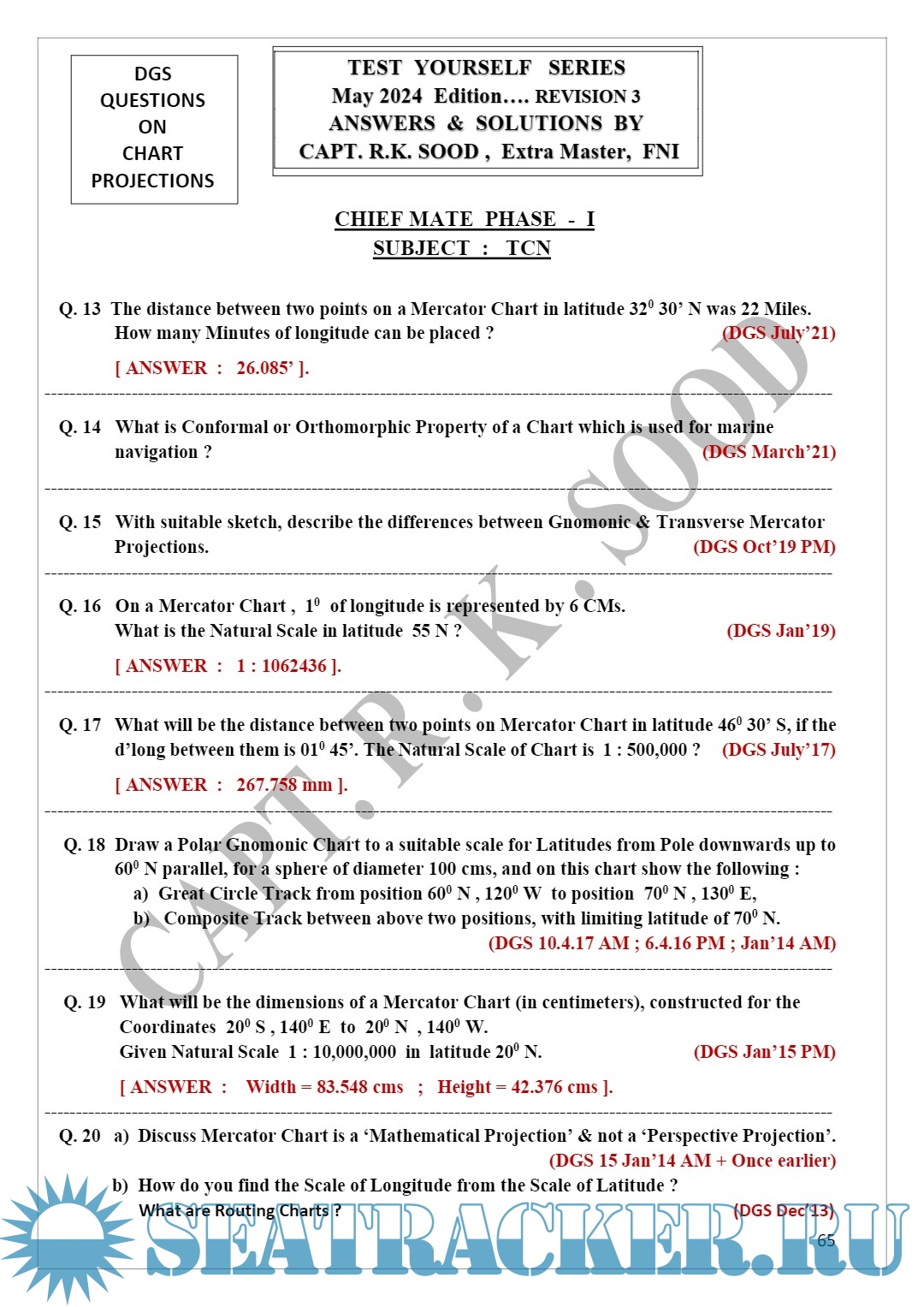 As a starter, under ‘TEST YOURSELF SERIES’ , I have tried to venture in to the field of ‘TERRESTRIAL & CELESTIAL NAVIGATION’ (TCN) Subject of Chief Mate (F.G.) Level, notoriously considered by some to be the ‘Most Difficult Paper to Crack’ among all Subjects from Master (F.G.) down to Second Mate (F.G.) levels !