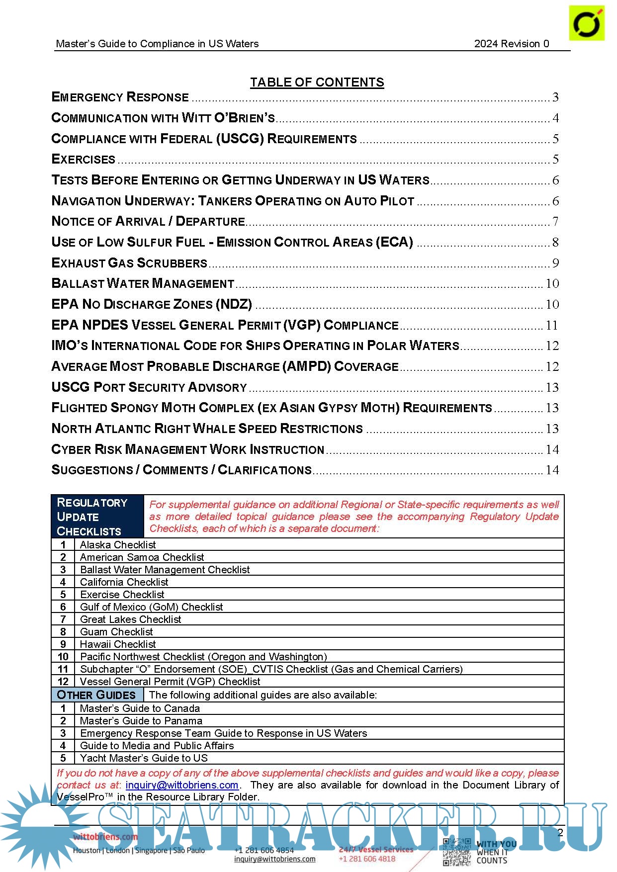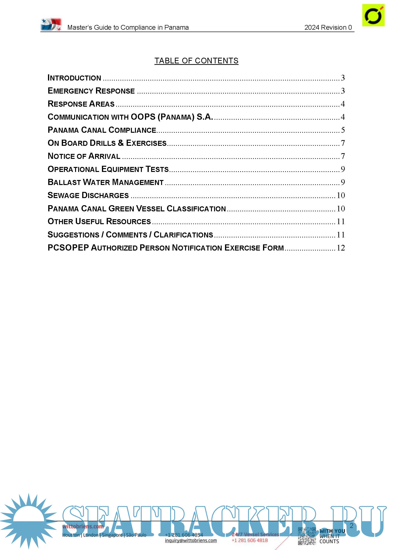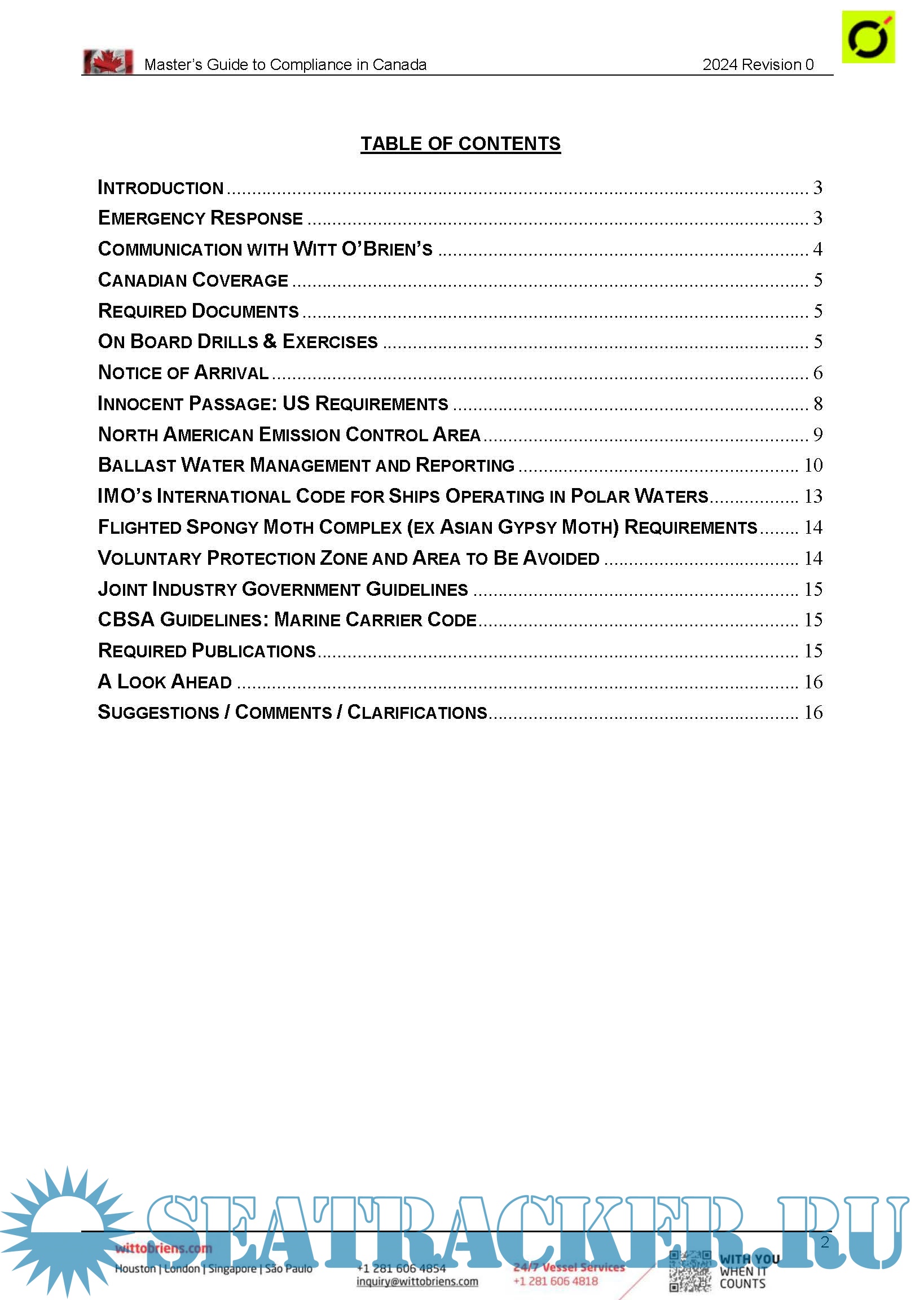 Year: 2024 Language: English Author: Witt O'Brien's Genre: Guide Edition: Rev.0 2024 Format: PDF Quality: eBook Pages count: Multiple Description: The Master of any vessel making a call to the United States, Canada or Panama (OOPS especially when transiting the Panama Canal) faces several regulatory issues that are specific to the country of call. Your vessel is enrolled with Witt O’Brien’s to ensure compliance with multiple regulations. These guides are intended to help the Master effectively and efficiently face these issues. Use of the directions in the guides will allow Witt O’Brien’s to better serve you. Information designed to save you time and effort is present in orange italics.