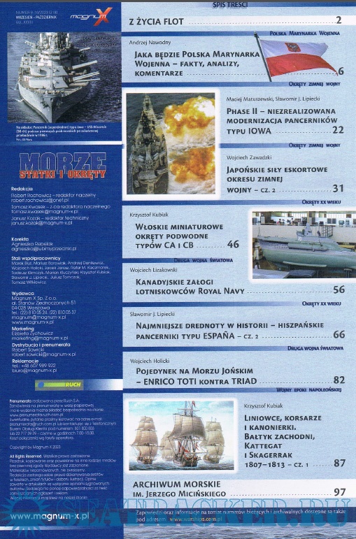 Description: Польский морской журнал. Издается с 1996 года, первоначально как ежеквартальный. С 1999 года издается раз в два месяца, а с 2007 года-как ежемесячный. Первоначально назывался Morza Statki i Okrety, в 2006 году переименован в Morze Statki i Okrety. С 2004 года полностью цветной (ранее только вставки). В 2008 году стали издаваться специальные выпуски, первоначально нерегулярные. С 2014 года выпускается как обычное издание и специальное издание, с непрерывной нумерацией.