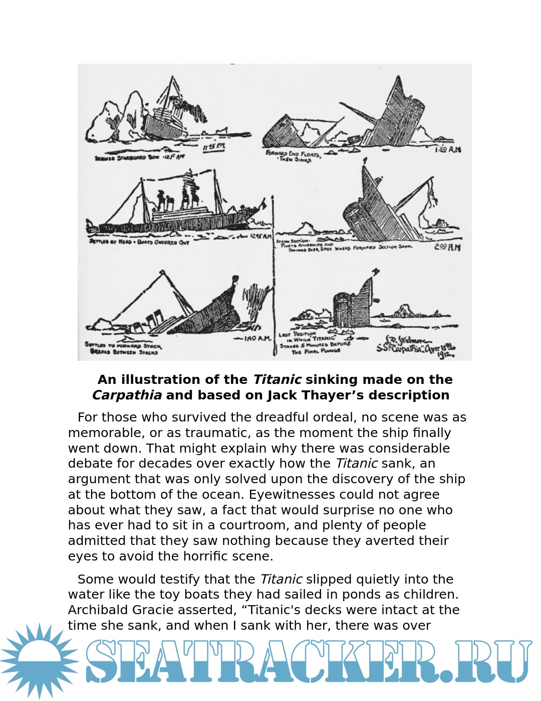 “Barrels and chairs were being thrown overboard. Then suddenly, when we still seemed very near, we saw the ship was sinking rapidly. I was in the bow of the boat with my daughter and turned to see the great ship take a plunge toward the bow, the two forward funnels seemed to lean and then she seemed to break in half as if cut with a knife, and as the bow went under the lights went out; the stern stood up for several minutes, black against the stars, and then that, too, plunged down, and there was no sound for what seemed like hours, and then began the cries for help of people drowning all around us, which seemed to go on forever." - Emily Ryerson