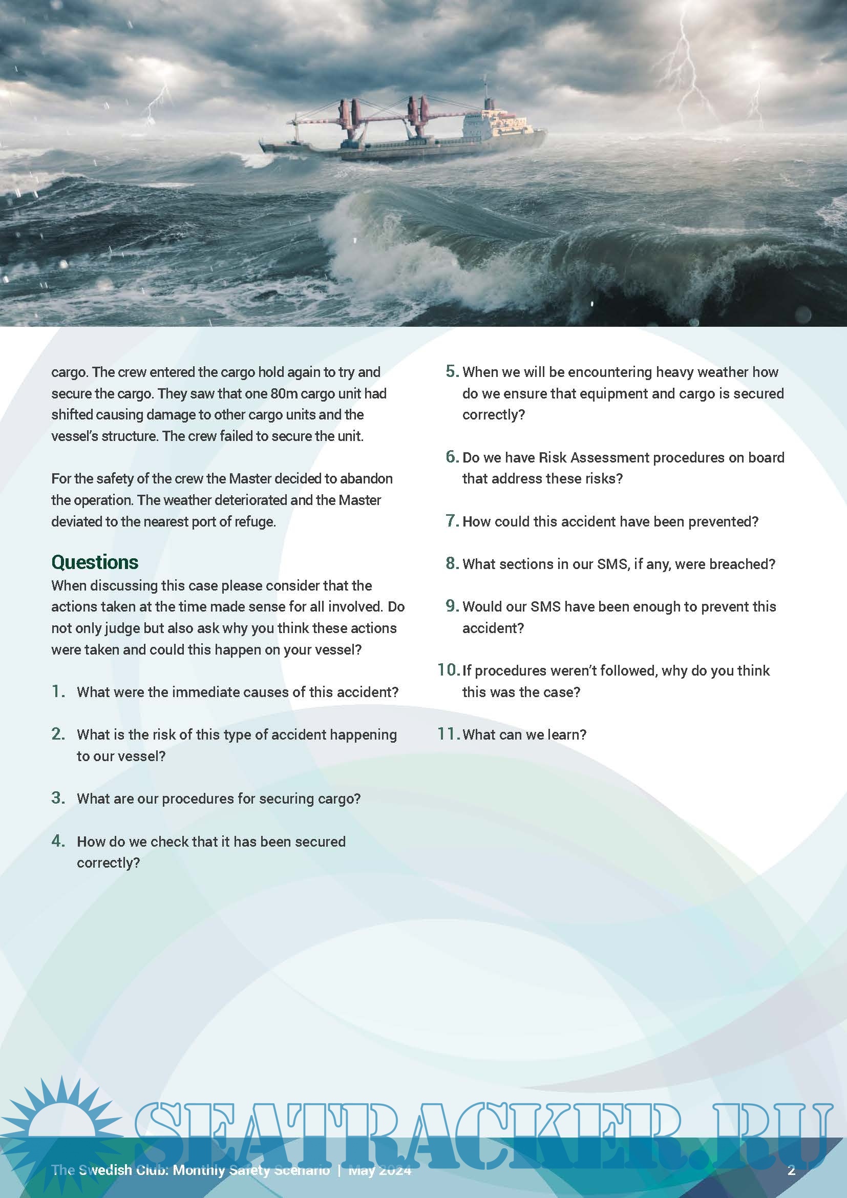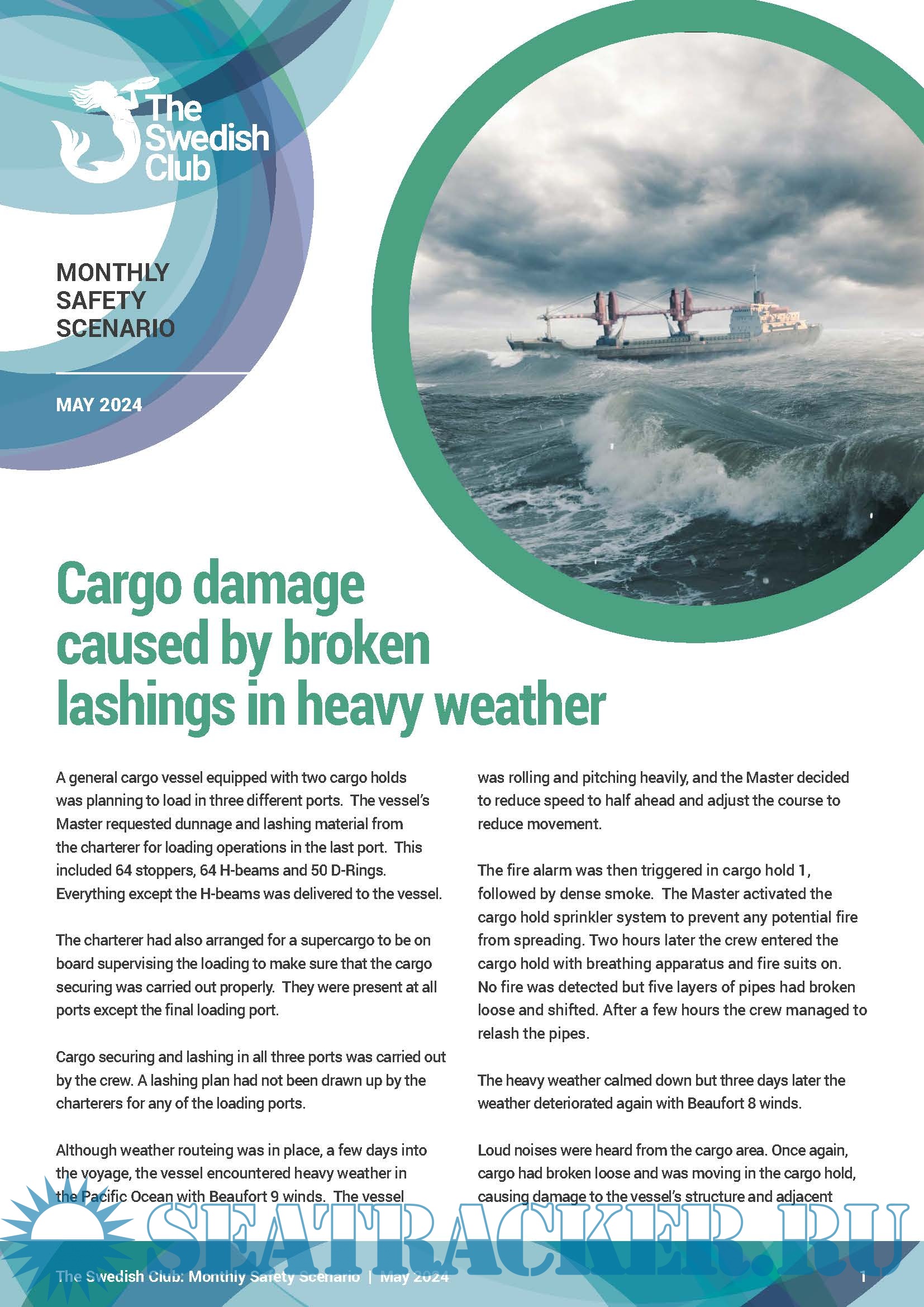 Description: The Swedish Club published its Monthly Safety Scenario for May 2024, describing an incident in which cargo damage was caused by broken lashings in heavy weather.