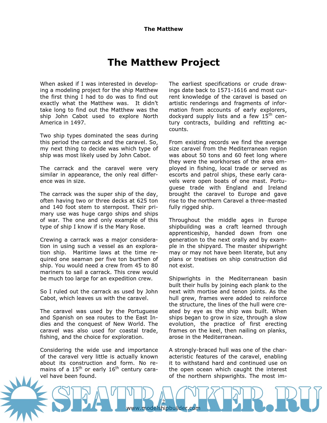 Year: - Language: English Author: Collective Genre: Manual Publisher: ModelShipBuilder Format: PDF Quality: eBook Pages count: 100 Description: Our building project contains three sources of information. First, the scarce historical information, next, a replica built in Bristol England (the location from which the original Matthew sailed) and a replica built in Bonavista, Newfoundland (the location believed to be the landing place of John Cabot in 1497).