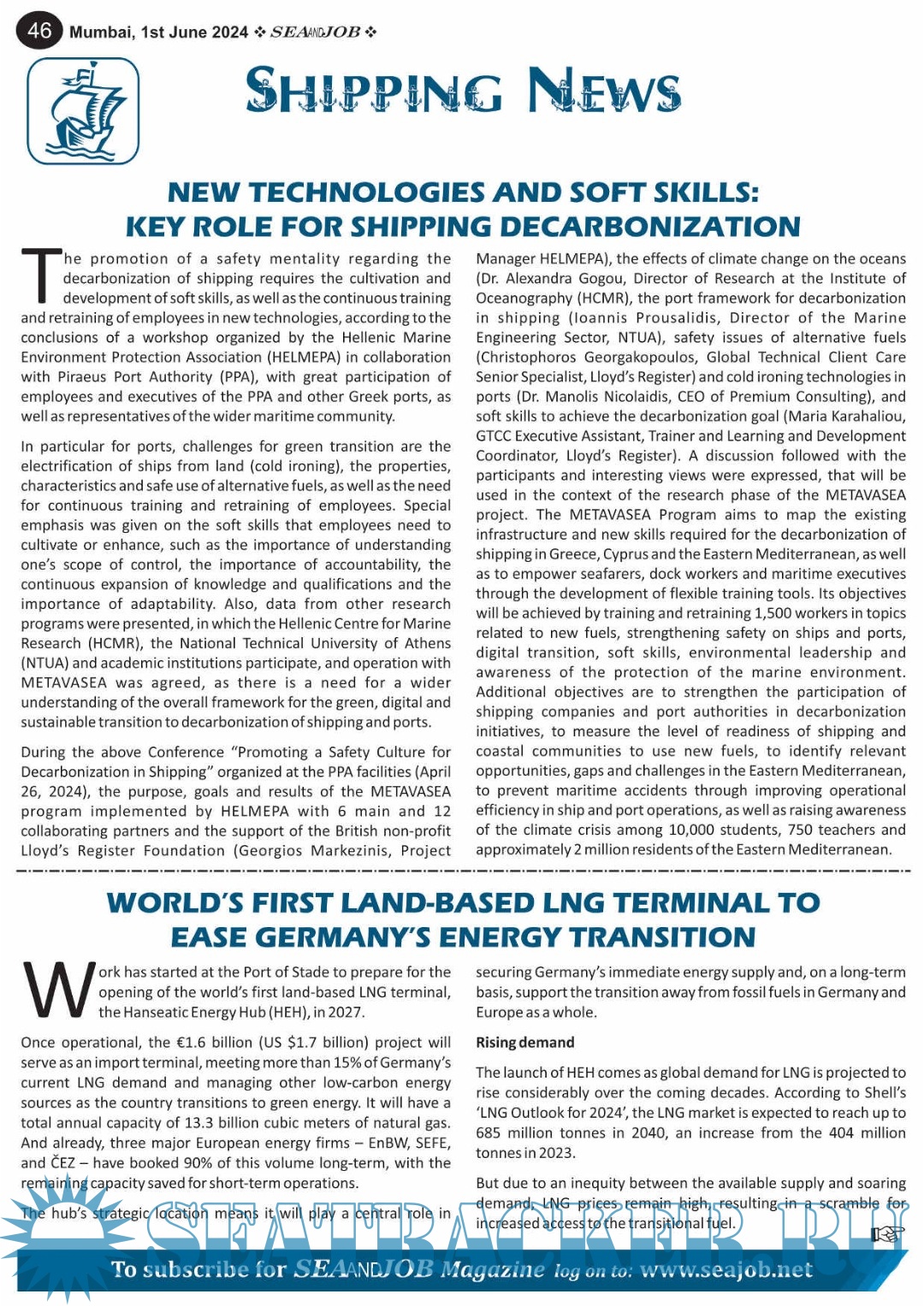 Year: 2024 Language: English Author: Sea Line Group Genre: Periodical (magazine) Edition: Vol. XVII, No. 11/24 Format: PDF Quality: eBook Pages count: 76 Description: The Sea and Job magazine launched in May 2007, was the second venture of Sea Line Group succeeding 'seajob.net' bringing the much renowned essence to the Group, the Sea and Job Magazine quickly gained popularity, becoming the No. 1 Shipping Magazine that came to be widely circulated all over India.Sea and Job over the years has evolved as the most trusted, ethical, objective and read maritime publication that possesses a large database of subscribers from various verticals in the industry.The magazine provides informative and interesting articles covering not just the shipping world but also the world outside it. Sea and Job is also a medium for the shipping/ manning companies to advertise marine jobs and also to promote their organization by publicizing internal activities like seminars, sports events and parties.Some notable endeavors of the magazine include the Know Your Recruiter Column, the Sailing Episodes Column and the Marine Insights section. The consistent efforts and the dedication to provide extraordinary services to the industry has resulted in the magnifying popularity and patronage of Sea and Job. Additional info: 1-15 June 2024.