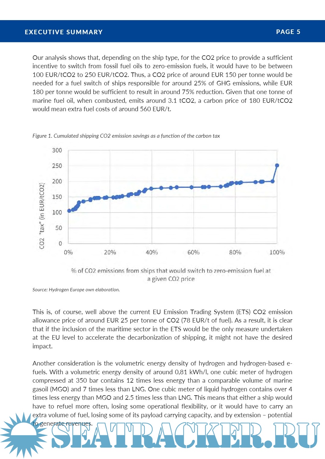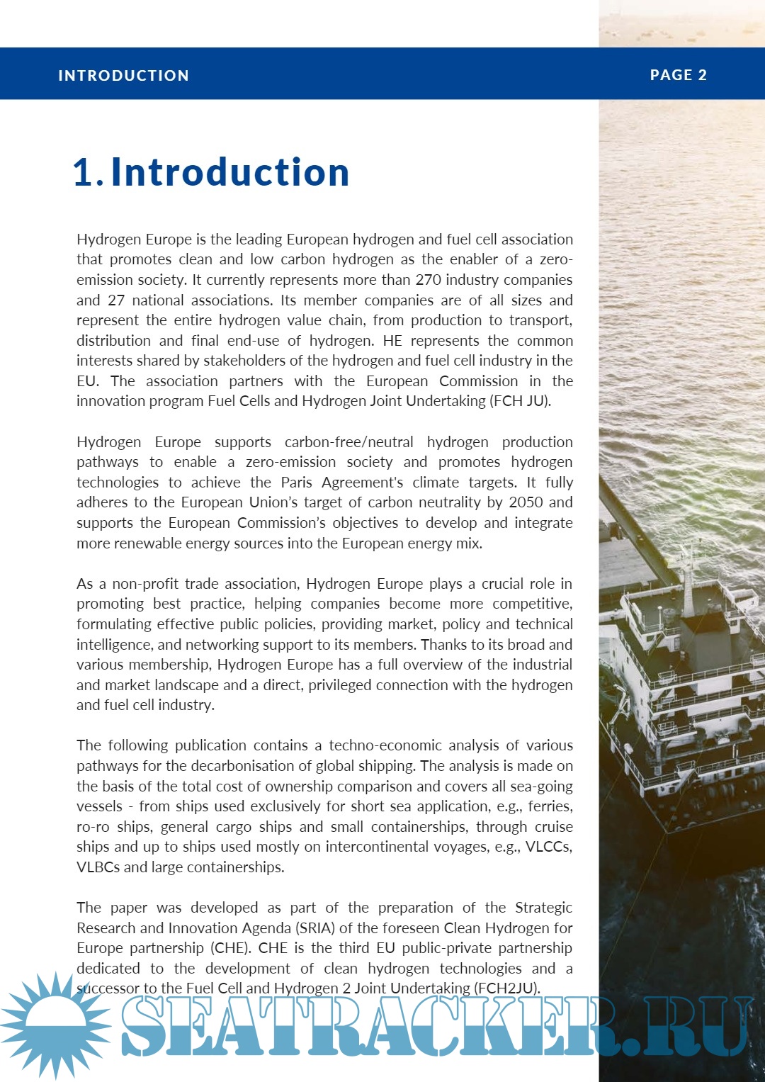 Description: Hydrogen Europe is the leading European hydrogen and fuel cell association that promotes clean and low carbon hydrogen as the enabler of a zeroemission society. It currently represents more than 270 industry companies and 27 national associations. Its member companies are of all sizes and represent the entire hydrogen value chain, from production to transport, distribution and final end-use of hydrogen. HE represents the common interests shared by stakeholders of the hydrogen and fuel cell industry in the EU. The association partners with the European Commission in the innovation program Fuel Cells and Hydrogen Joint Undertaking (FCH JU). Hydrogen Europe supports carbon-free/neutral hydrogen production pathways to enable a zero-emission society and promotes hydrogen technologies to achieve the Paris Agreement's climate targets. It fully adheres to the European Union’s target of carbon neutrality by 2050 and supports the European Commission’s objectives to develop and integrate more renewable energy sources into the European energy mix. As a non-profit trade association, Hydrogen Europe plays a crucial role in promoting best practice, helping companies become more competitive, formulating effective public policies, providing market, policy and technical intelligence, and networking support to its members. Thanks to its broad and various membership, Hydrogen Europe has a full overview of the industrial and market landscape and a direct, privileged connection with the hydrogen and fuel cell industry. The following publication contains a techno-economic analysis of various pathways for the decarbonisation of global shipping.