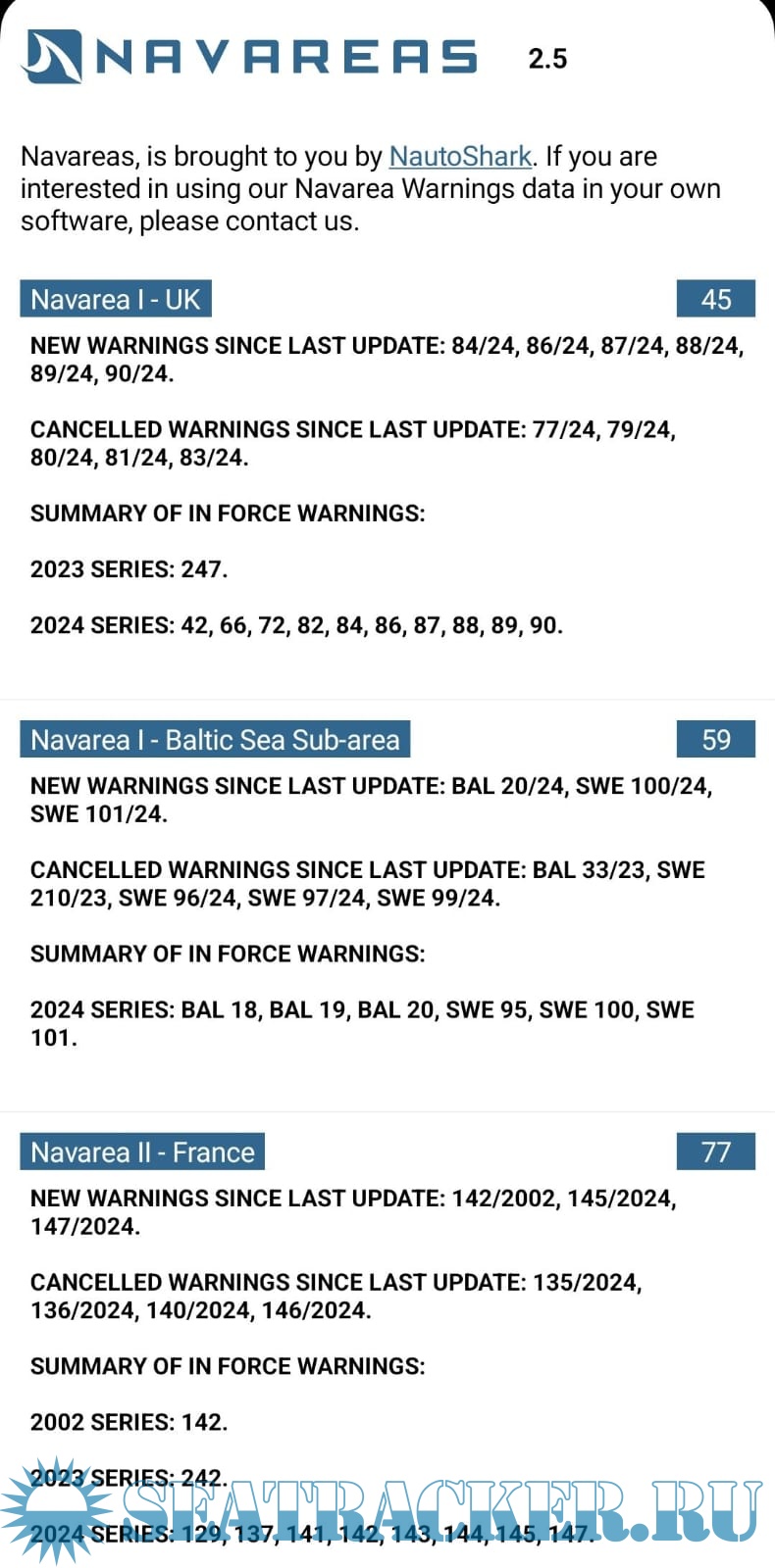 Year: 2024 Version: 2.5 Developer: NautoShark Platform: Android System Requirements: Requires Android 4.4 and up. Localization: English Crack: Not needed Description: The NautoShark Navarea Warnings (Navtex) app helps Mariners view the latest Navarea Warnings from their mobile device.While SOLAS vessels should always use their Navtex receiver to obtain the latest areas, there can be gaps in this data especially if you move into a new area. The Navtex only lists a full list of active warnings numbers, but not the actual text of the old warning. Using our app you can quickly and easily obtain this information.For leisure craft that are too small to require a Navtex, it is still important to receive and check the latest Navarea Warnings. Our app allows Mariners to obtain this data and take it on their voyage with them. Navarea Warnings are now available for all 21 areas. If you have any questions or suggestions, please feel free to contact us at [email protected]. We would be delighted to hear from you.