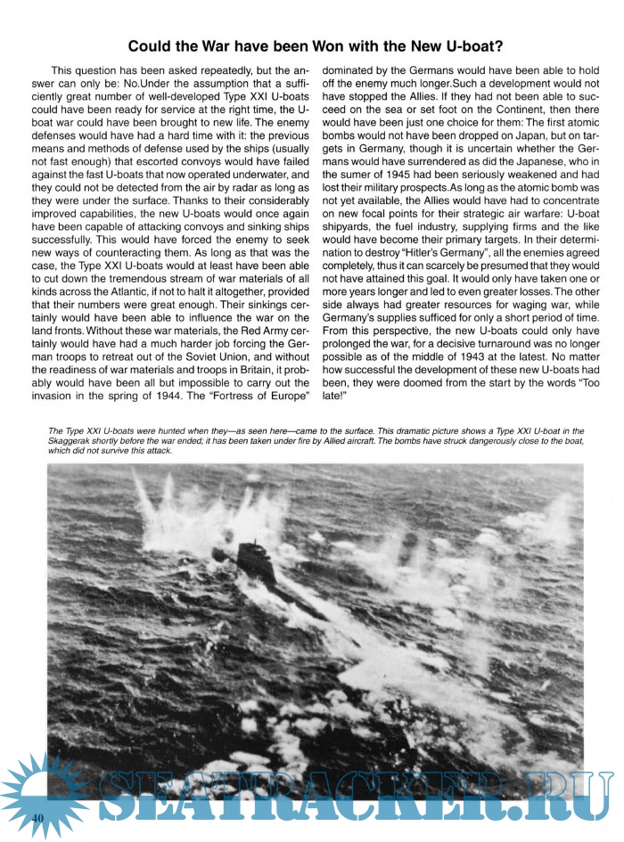 This book covers the history leading up to the development of the Type XXI, as well as covering the actual development and short usage of the U-boat.