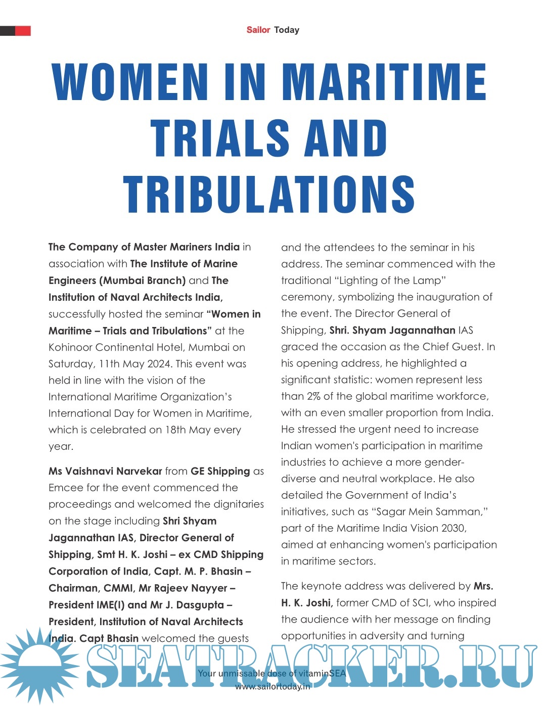 Description: Sailor Today is an International Shipping magazine published monthly. With `The Seafarer’ who is also our nation`s ambassador overseas, as our Prime Focus, we endeavor to keep the Maritime Profession in the forefront of our publication as well as all our events. We at `Sailor Today’ carry a vision to Promote the Maritime Profession, which is the backbone of our country`s economy.