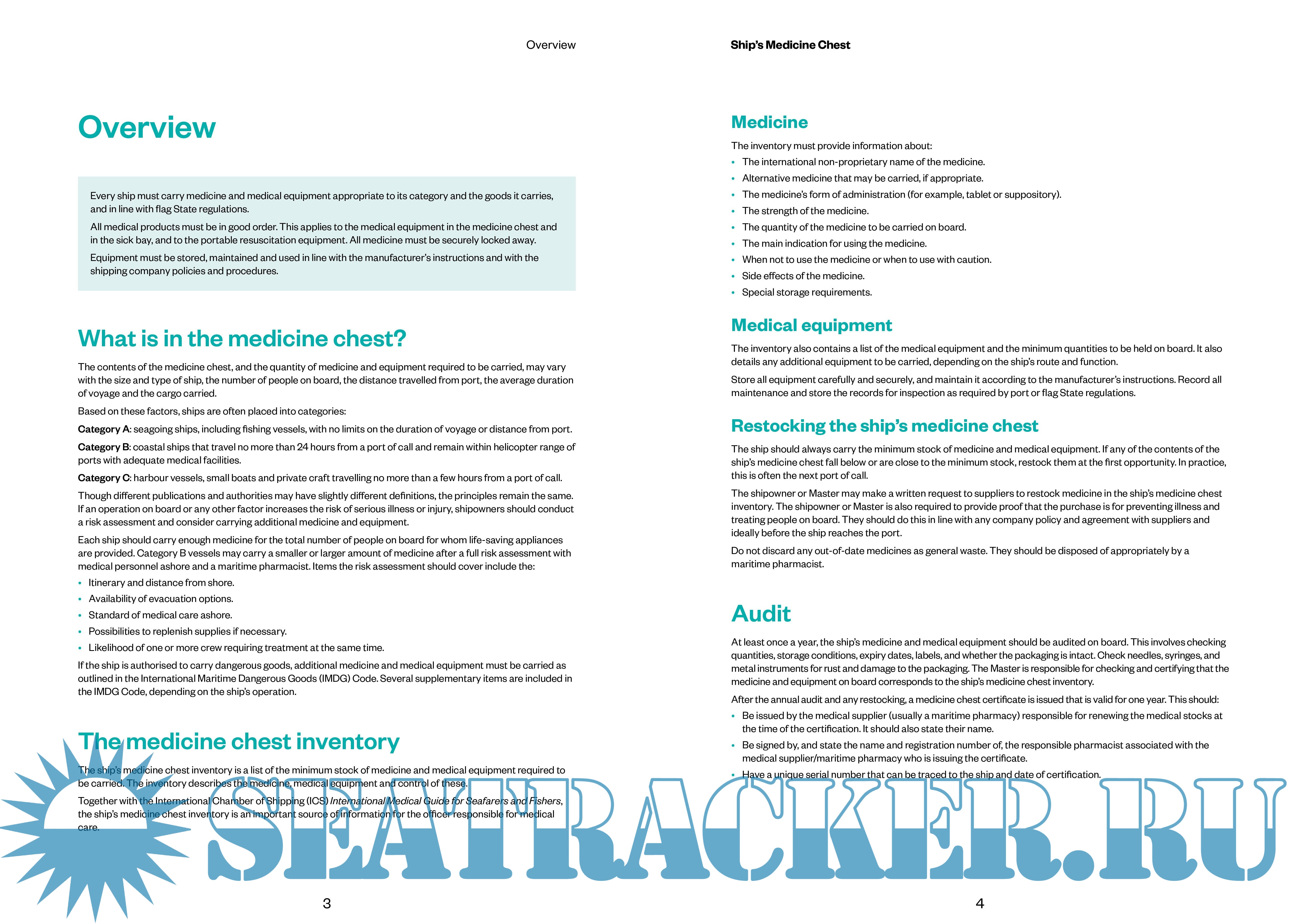 Year: 2023 Language: English Author: International Chamber of Shipping Genre: Guide Publisher: Marisec Publications Edition: 1 Format: PDF Quality: OCR with errors Number of pages: 58 Description: Ship's Medicine Chest To accompany the International Medical Guide for Seafarers and Fishers Marisec Publications has produced this guidance using reasonable care to ensure that it is accurate to the date of publication. The purpose of this publication is to act as only general guidance rather than definitive medical advice for a particular individual in receipt of treatment. Medical practice or recommendations may have changed from the date of publication and users of this publication are strongly advised to seek confirmation that the information remains compliant with standards and practices of the relevant jurisdiction in which treatment is provided at the date of treatment. No warranty is made as to the completeness or accuracy of the information provided in this publication. This publication is not intended to be, and should not be used as, a substitute for the clinical judgement, advice or diagnosis provided by a doctor or other qualified healthcare professional and medical advice should be sought as soon as practically possible. Reliance on this guidance is at the user's own risk.