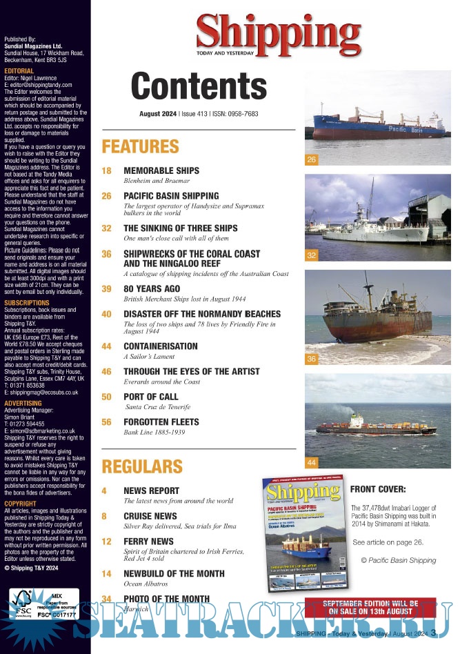 Year: 2024 Language: English Author: Nigel Lawrence (Editor) Genre: Periodical (magazine) Edition: 2024-08 Format: PDF Quality: eBook Pages count: 68 Description: Shipping T&Y is a monthly magazine for the shipping enthusiast offering up-to-date information, topical and in-depth historical articles alongside images, many of which are exclusive to the magazine.Shipping Today & Yesterday is a specialist magazine for the shipping enthusiast offering up-to-date information, topical and in-depth historical articles.Shipping Today & Yesterday was first produced in March 1990 by, the then Editor and Publisher, John Young. The first edition stated that it would, “offer a news service covering important developments in the Shipping industry Today and will look back at ships and events of Yesterday, with regular features on merchant ships