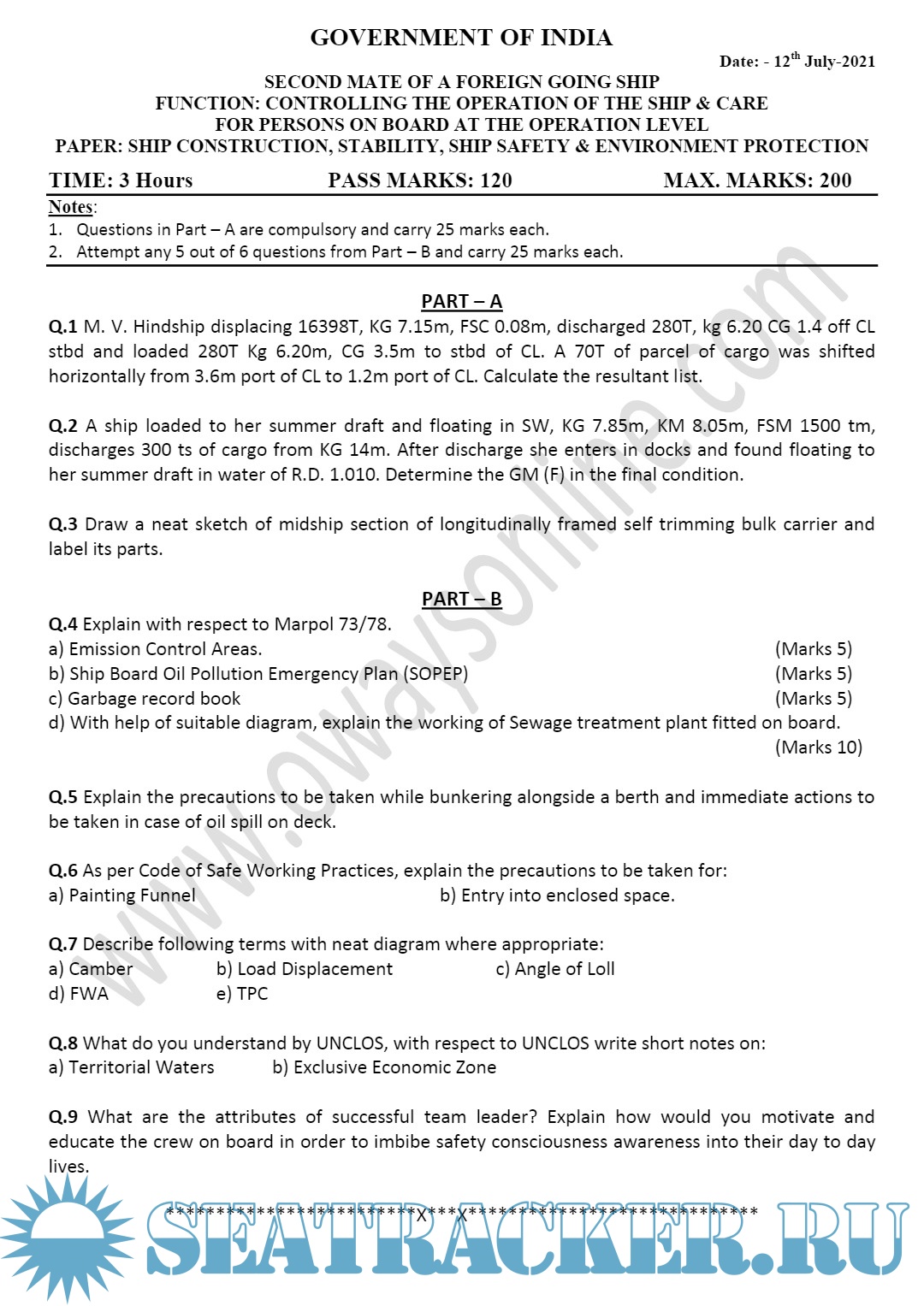 Question Paper Set (July 2023) for Second Mate (F.G.) Mercantile Marine Department (MMD), India…