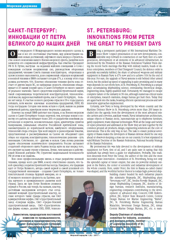 Год выпуска: 2017 Язык: Русский Автор: группа авторов Жанр: Периодическое издание (журнал) Издательство: Зеркало Петербурга Формат: PDF Качество: Изначально компьютерное (eBook) Количество страниц: 40 Описание: В северной столице проводятся фундаментальные исследования и создаются перспективные образцы военной техники и вооружения. Важнейшая роль Петербурга в российском кораблестроении и оборонно-промышленном комплексе придают особый статус Международному военно-морскому салону. Он проводится с 2003 года и стал одним из наиболее ярких событий в деловом календаре Петербурга, снискал репутацию одного из самых престижных форумов мирового морского сообщества.