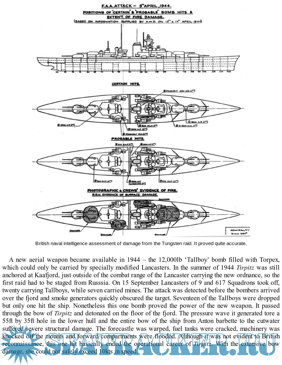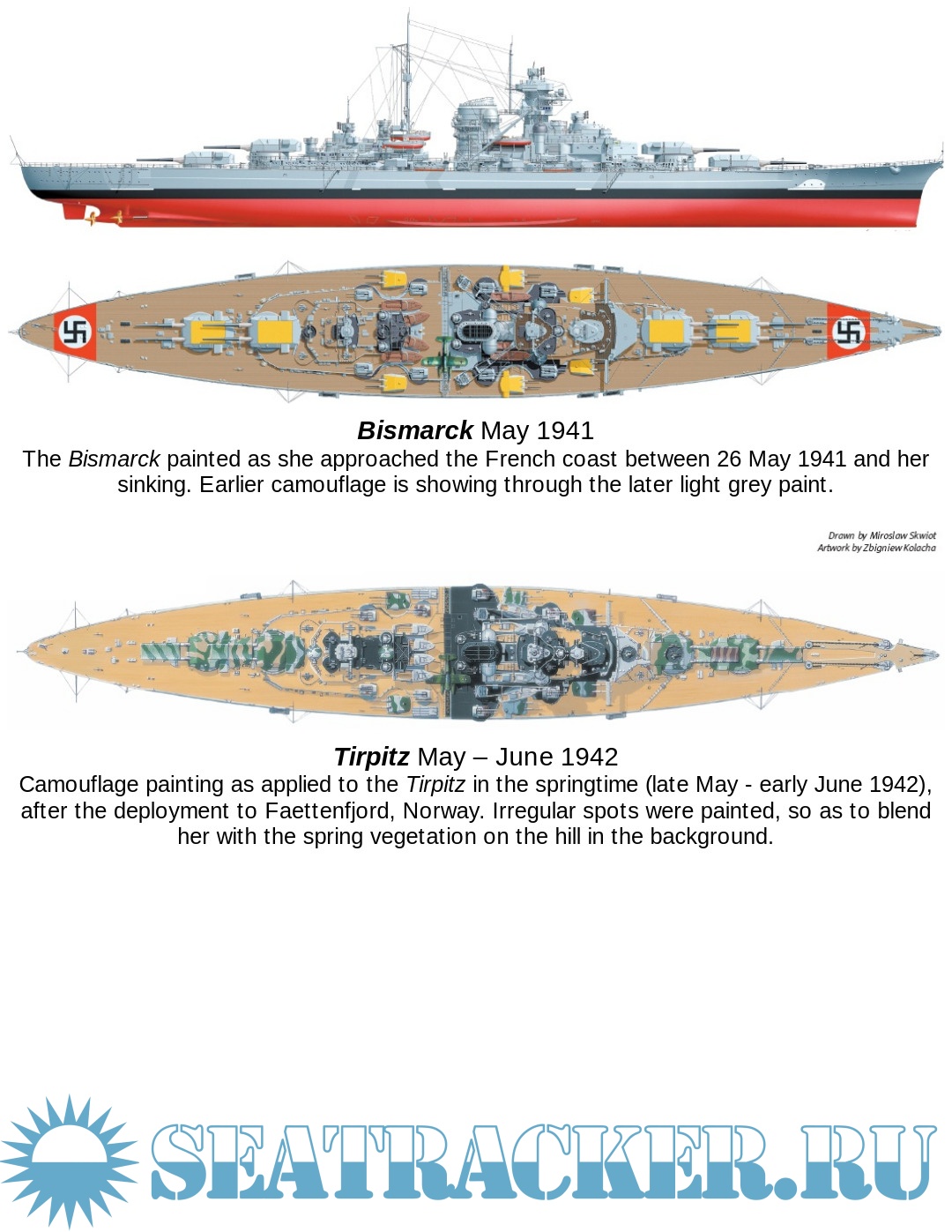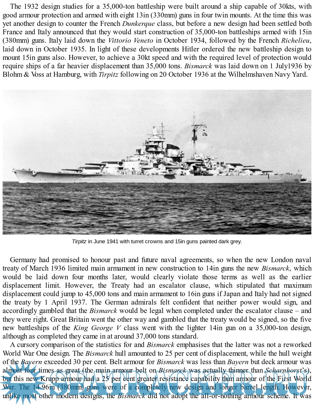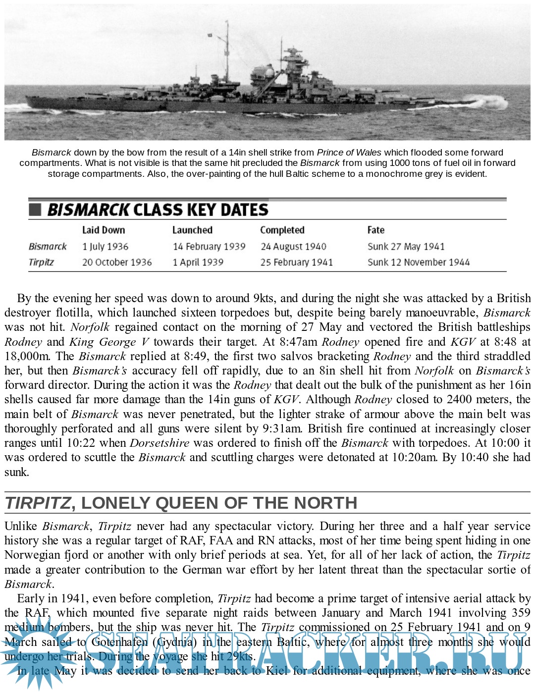 Year: 2008 Language: English Author: Backer S. Genre: History Format: PDF/EPUB Quality: eBook Pages count: 137 Description: Германские линкоры "Бисмарк" и "Тирпиц": характеристики, вооружение, боевой путь. This volume covers the famous German sister-ships whose fates were so very different - Bismarck had a short but glorious career, first sinking HMS Hood and then in turn being sunk by the Home Fleet, whereas the Tirpitz spent most of the war skulking in Norwegian fjords, fending off attacks by midget submarines and carrier aircraft before being finally sunk by enormous specially designed bombs dropped by RAF Lancasters.