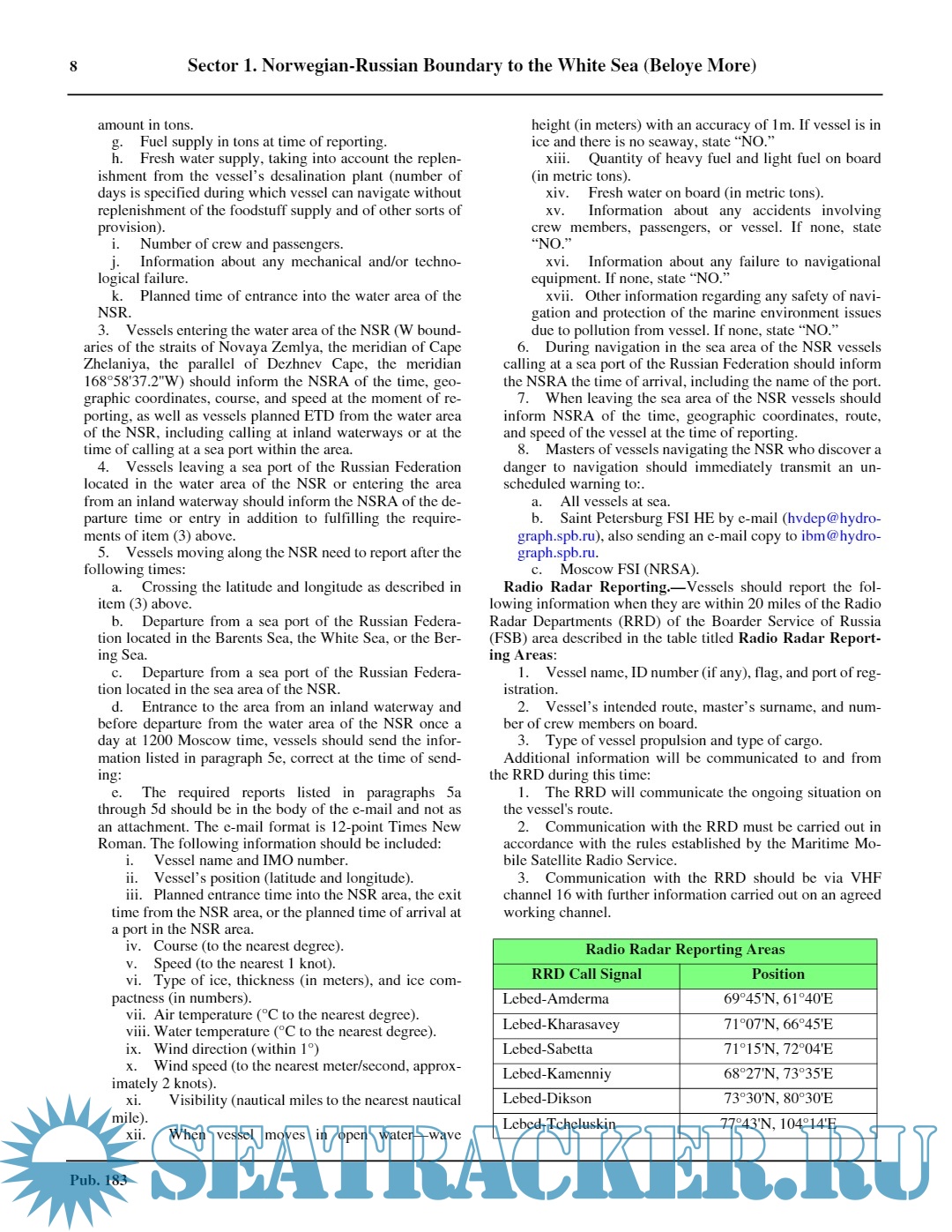 Year: 2021 Language: English Author: National Geospatial Intelligence Agency Genre: Practical guide Format: PDF Quality: eBook Pages count: 190 Description: Pub183 - Sailing Directions (Enroute) - North Coast of Russia (2021)" is an essential navigational guide for mariners traversing the challenging waters of Russia's northern coastline. This comprehensive volume offers detailed information on coastal geography, navigational hazards, climatic conditions, and port facilities. Updated for 2021, it includes critical updates on maritime regulations and route planning strategies to ensure safe and efficient voyages. Whether navigating the Barents Sea, the Kara Sea, or the Laptev Sea, this guide provides indispensable insights for a successful and secure passage through these remote and often treacherous waters.