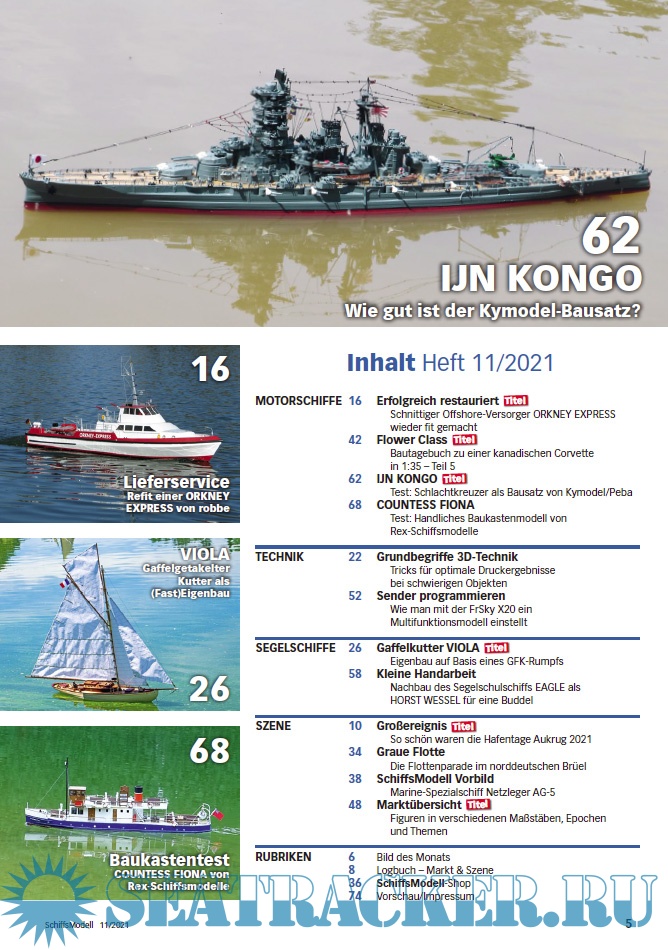 Year: 2021 Language: German Author: Mario Bicher (Redaktor) Genre: Periodical (magazine) Edition: 2021-11 Format: PDF Quality: eBook Pages count: 76 Description: SchiffsModell is the magazine for those who enjoy radio controlled and fully functional Modellnachbauten of ships of all kinds.