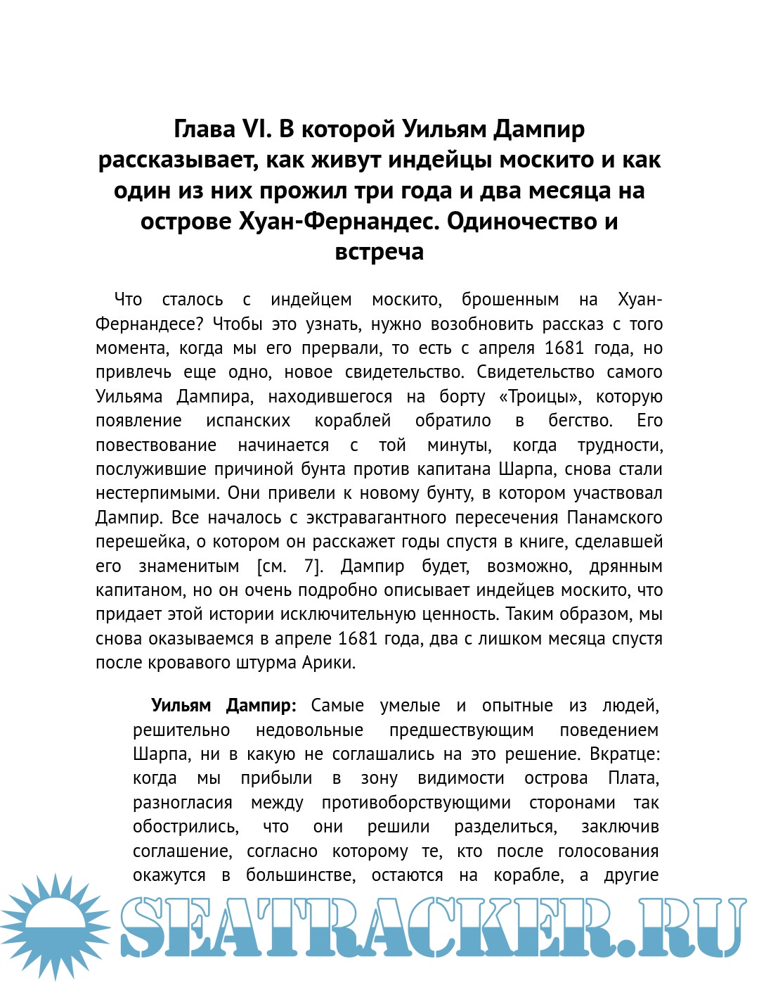 Описание: …Первого февраля 1709 года корабль английских пиратов бросает якорь вблизи необитаемого острова Хуан-Фернандес, затерянного посреди Тихого океана. Экипаж замечает огонь на берегу. На следующий день часть команды, отправленная к берегу на шлюпке, находит «человека, одетого в козьи шкуры и кажущегося более диким, чем их первые обладательницы». Это Александр Селькирк – шотландский моряк, оставленный на острове четыре года назад, он с трудом припоминает родной язык, чтобы рассказать капитану Вудсу Роджерсу, каким образом ему удалось выжить. Его история через несколько лет вдохновит Даниеля Дефо на создание первого бестселлера «Робинзон Крузо».
