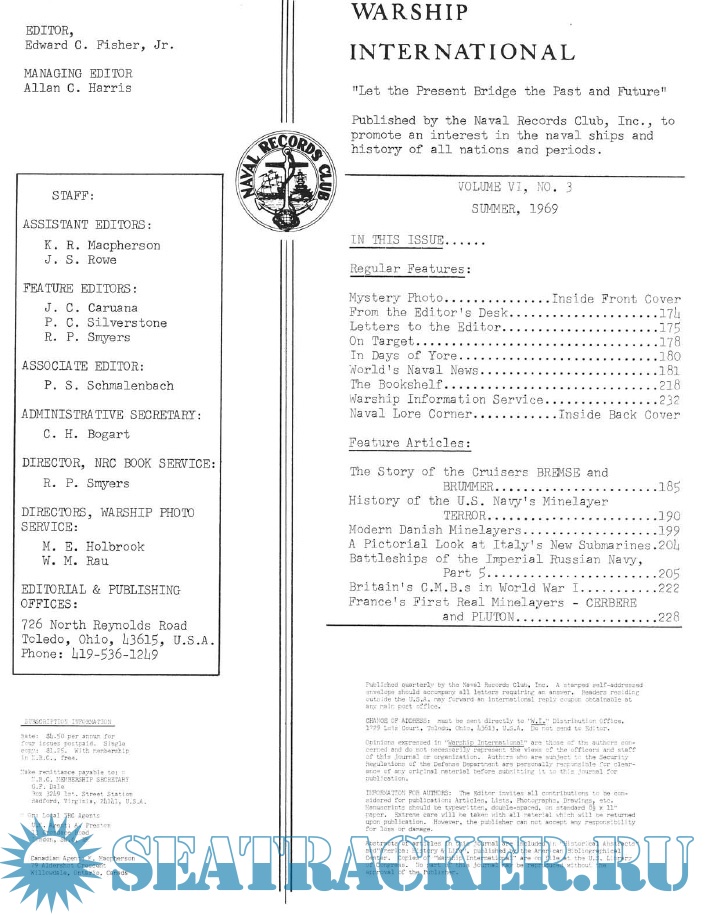 Year: 1969 Language: English Author: Edward C. Fisher (Editor) Genre: Periodical (magazine) Edition: 1969-3 Format: PDF Quality: Scanned pages Pages count: 86 Description: From a small beginning in 1964, this quarterly journal has become internationally recognized as the most authoritative English-language publication in the warship field. Each issue averages 100 pages, with fact-filled articles, mainly but not exclusively the original work of our members. Subjects cover all navies and all types of ships from about 1860 to date, liberally illustrated with photographs which are highly praised for their quality, many of which have rarely been printed before, and with excellent line drawings and plans-a valuable resource for ship modelers.