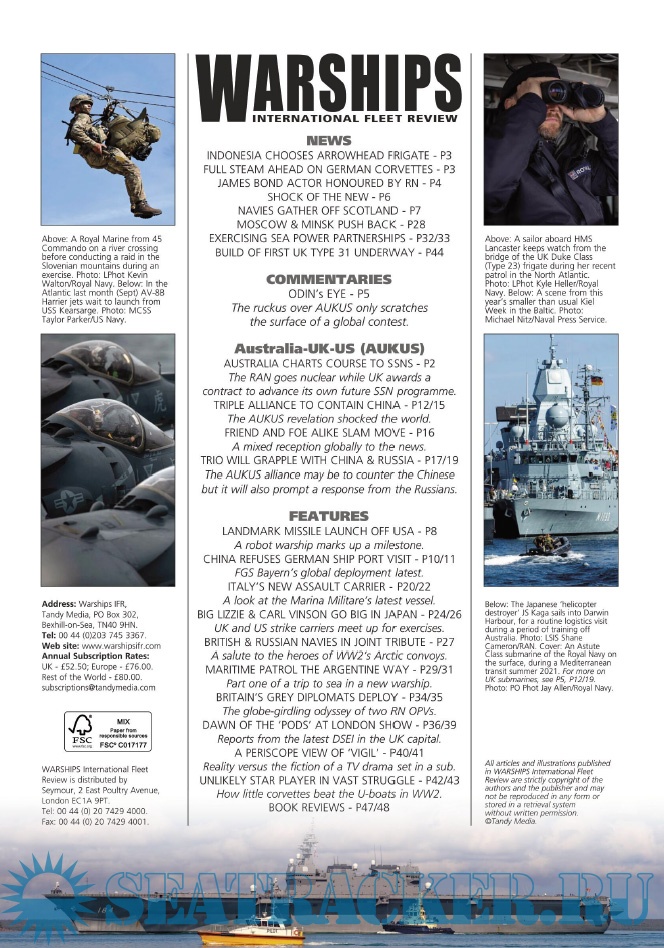 Description: Warships IFR puts the spotlight on the latest developments in the world’s navies. It covers current defence issues and has comments by leading analysts. The magazine regularly includes features on the Royal Navy and the US Navy in addition to incorporating news and features on all other navies across the globe. Warships IFR frequently carries in-depth articles on naval heritage.WARSHIPS International Fleet Review is published 12 times a year by Tandy Media Ltd who also publish Shipping Today & Yesterday (which provides news and features from the world of merchant shipping).