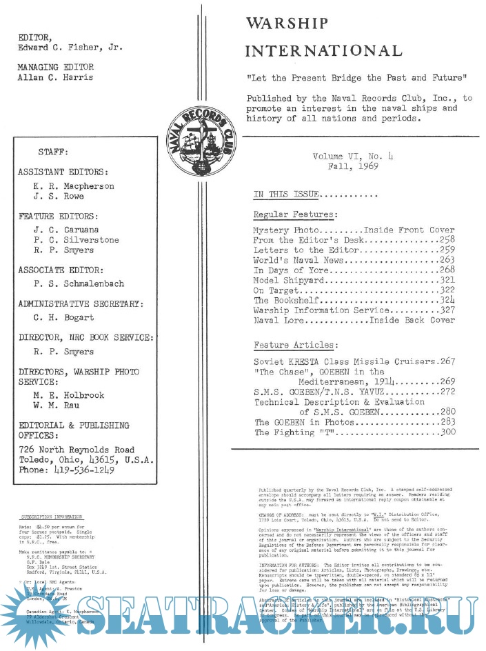Year: 1969 Language: English Author: Edward C. Fisher (Editor) Genre: Periodical (magazine) Edition: 1969-4 Format: PDF Quality: Scanned pages Pages count: 107 Description: From a small beginning in 1964, this quarterly journal has become internationally recognized as the most authoritative English-language publication in the warship field. Each issue averages 100 pages, with fact-filled articles, mainly but not exclusively the original work of our members. Subjects cover all navies and all types of ships from about 1860 to date, liberally illustrated with photographs which are highly praised for their quality, many of which have rarely been printed before, and with excellent line drawings and plans-a valuable resource for ship modelers.