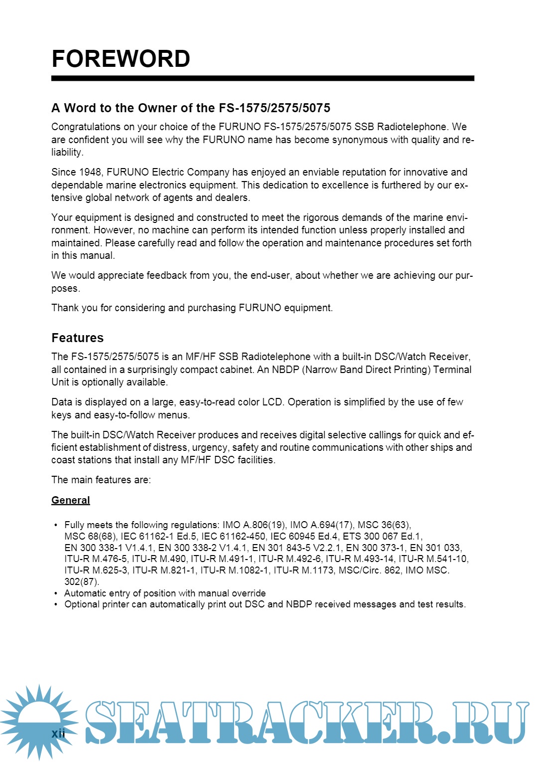 Description: This Operator's manual describes precautions, operations and troubleshooting of FURUNO SSB RADIO TELEPHONE FS 1575/2575/5075