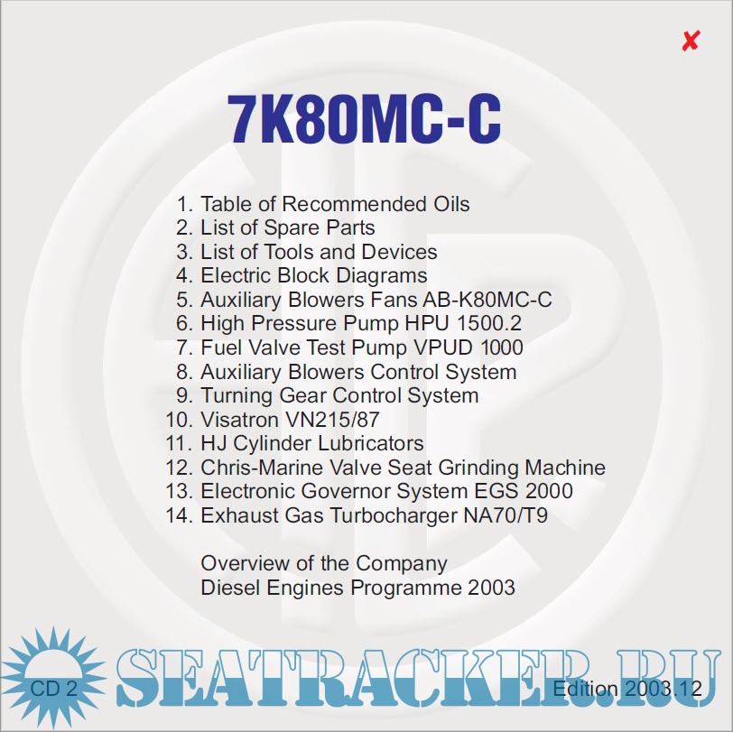 Year: 2003 Language: English Author: MAN B&W Genre: Documentation Publisher: MAN B&W Format: PDF Quality: eBook Pages count: >100 Description: Technical documentation for MAN B&W 7K80MCC engines Additional info: Use INDEX.PDF to start