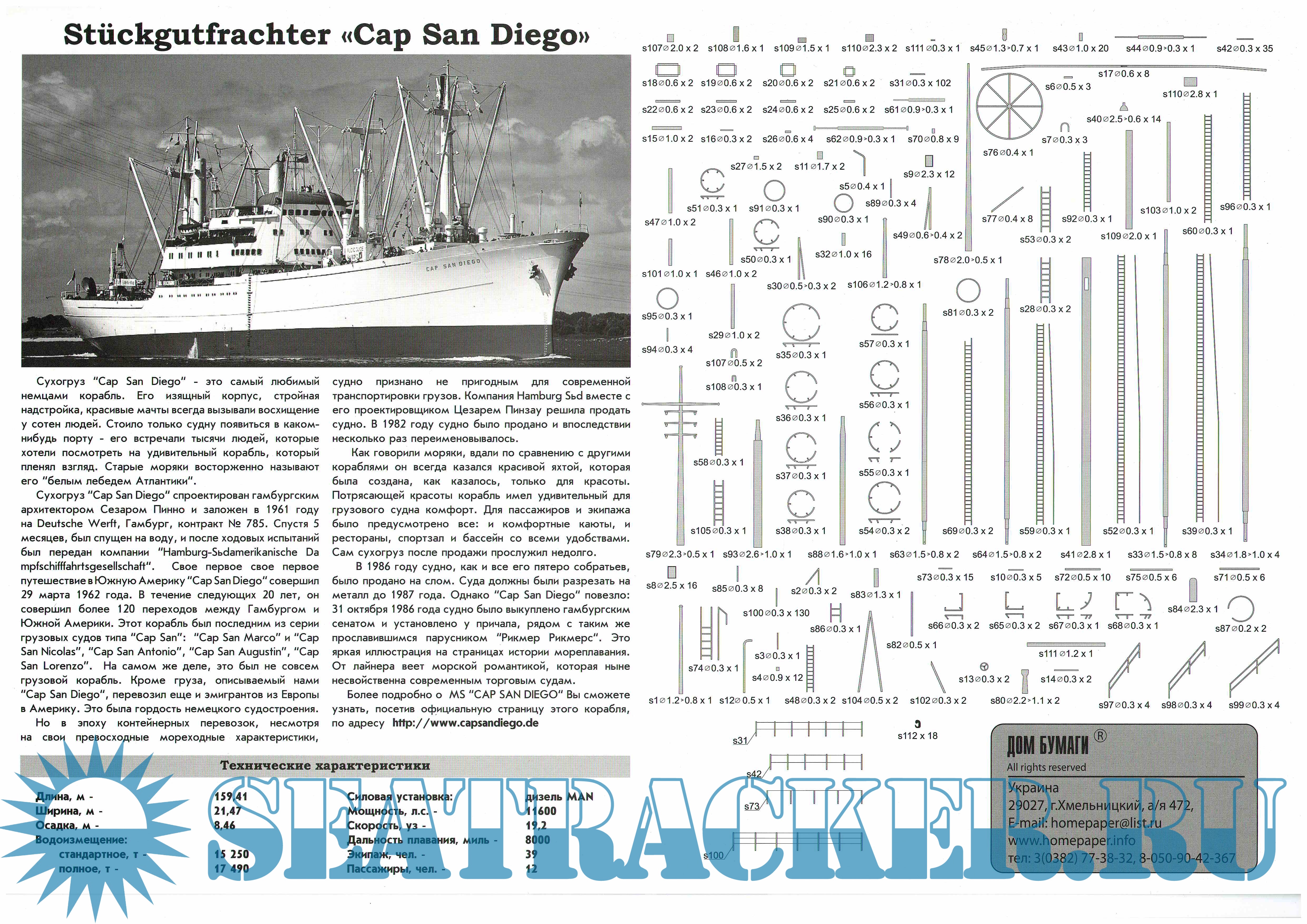 27 листов цветных выкроек и инструкций для изготовления бумажной модели сухогруза "Сан Диего" (Германия) в масштабе 1:200Скриншоты