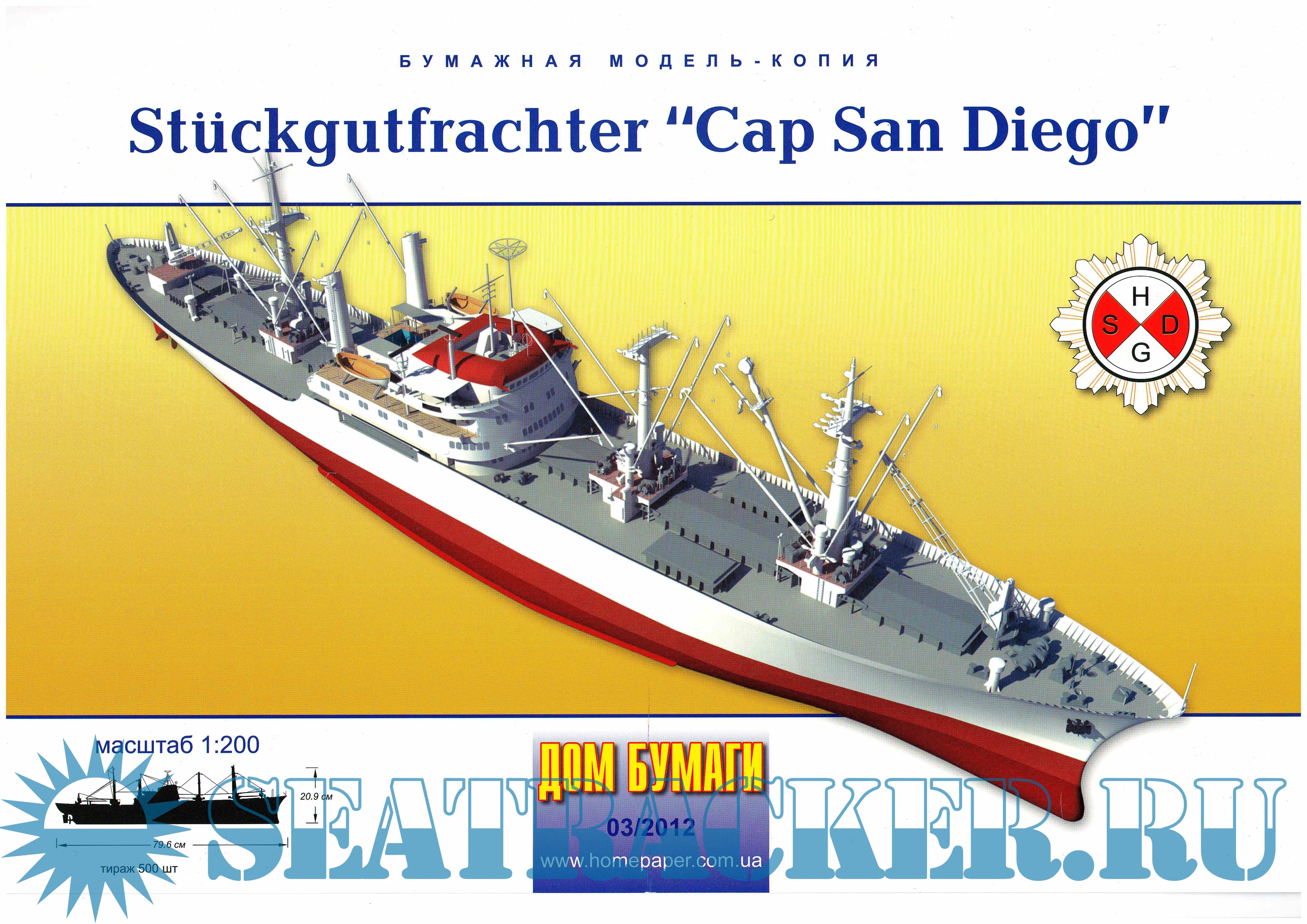 27 листов цветных выкроек и инструкций для изготовления бумажной модели сухогруза "Сан Диего" (Германия) в масштабе 1:200