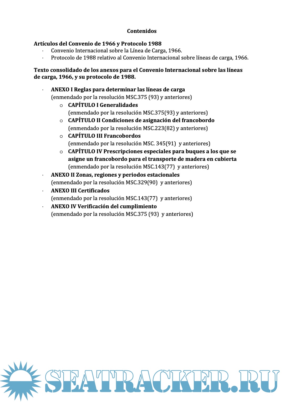 Este texto ha sido consolidado por la Subdirección General de Seguridad, Contaminación e Inspección Marítima de la Dirección General de Marina Mercante y Sergio Córdoba Rodríguez. Recogiendo todas las enmiendas al Convenio hasta el MSC 98, mediante documentos oficiales OMI y publicaciones BOE, llevado a cabo todos los esfuerzos para evitar errores y reproducir los textos originales fielmente. Aun así los lectores deberán ser conscientes que los textos de la OMI y del BOE prevalecerán en caso de discrepancias.