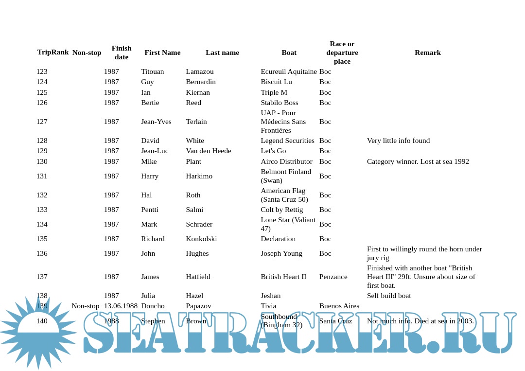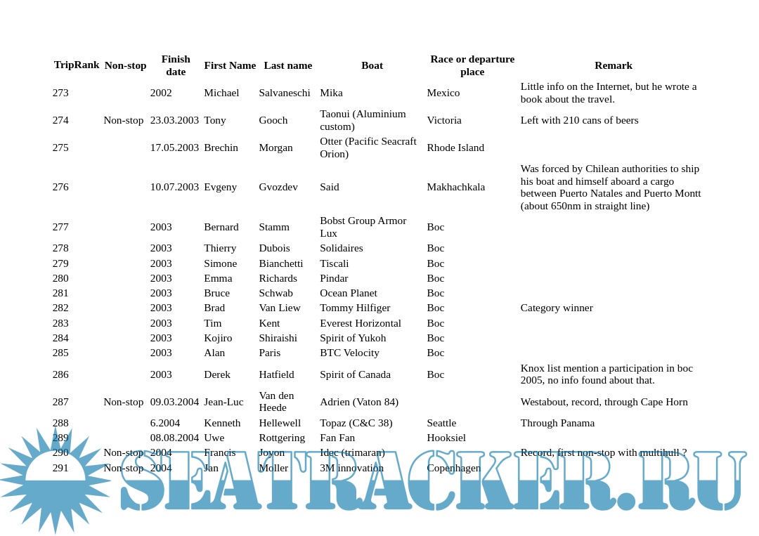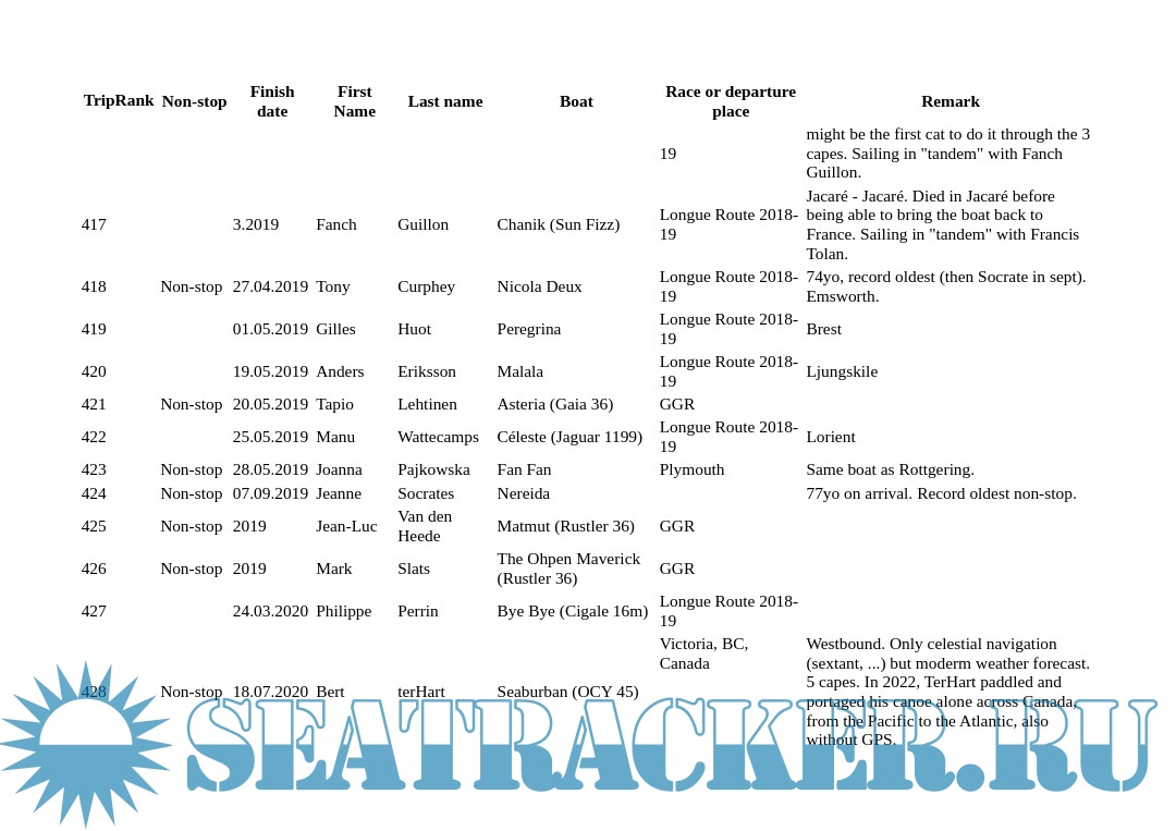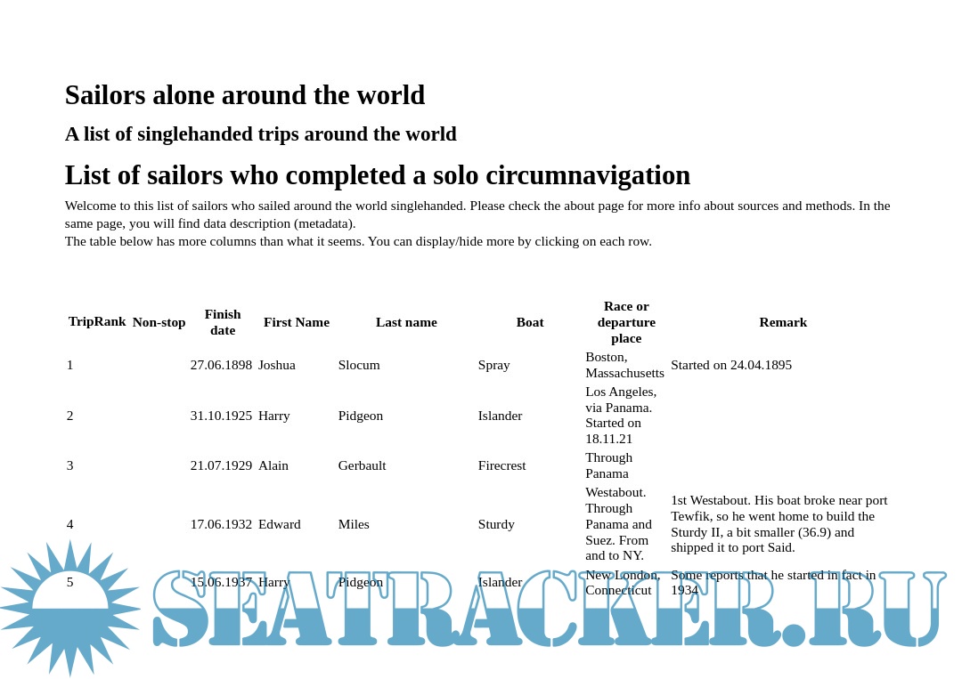 Welcome to this list of sailors who sailed around the world singlehanded. Please check the about page for more info about sources and methods. In the same page, you will find data description (metadata).
