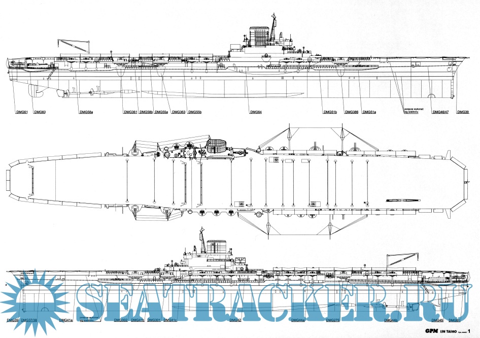 54 листа цветных выкроек и инструкций для изготовления бумажной модели японского авианосца IJN-TAIHO в масштабе 1:200