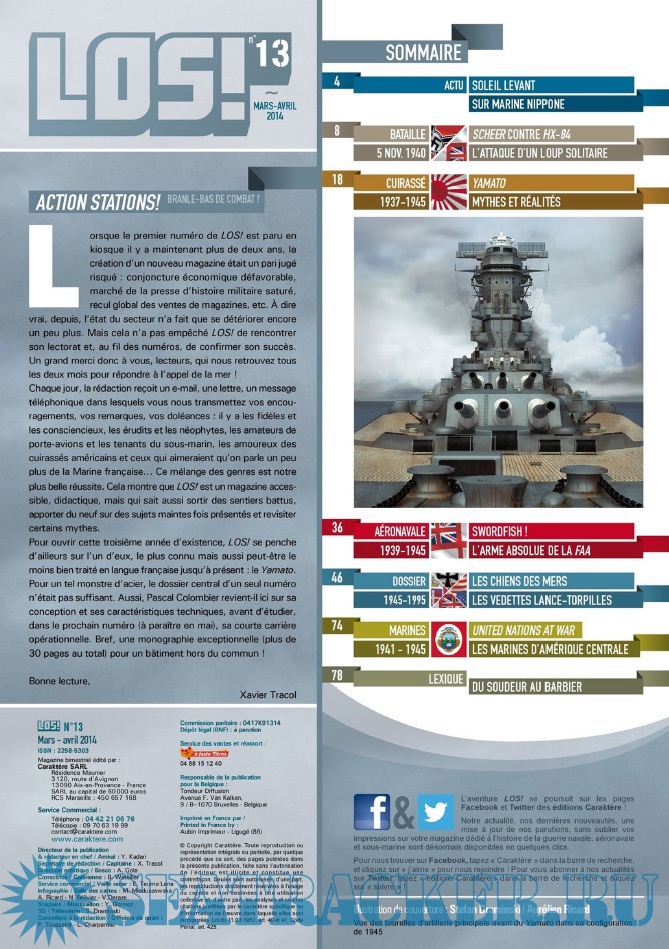 Description: LES ÉDITIONS CARAKTÈRE PRENNENT LE LARGE EN LANÇANT UN NOUVEAU MAGAZINE CONSACRÉ À LA GUERRE NAVALE !Les sujets passionnants ne manquent pas et LOS ! met un point d’honneur à les présenter au lecteur comme cela n’a jamais été fait dans la presse française jusqu’à présent. Un seul mot d’ordre pour l’équipe rédactionnelle : rigueur scientifique et présentation ludique !S’appuyant sur un fond photographique d’exception, sur des plans de bateaux et d’avions, les éditions Caraktère innovent une fois de plus en vous proposant aussi des vues 3D détaillées, le tout au service de textes soigneusement rédigés par des auteurs spécialisés. Vous comprendrez ainsi comment fonctionne un submersible, comment se déroule un combat naval, comment est conçu un cuirassé ou comment attaquent les avions-torpilleurs !Revivez au fil des pages l’aventure humaine exceptionnelle des matelots de la marine marchande affrontant les U-Boote en Arctique, ou celle des pilotes embarqués sur les porte-avions américains et japonais. Lisez les exploits des hommes-grenouilles italiens en Méditerranée, des équipages des vedettes lance-torpilles dans la Manche, des sous-marins soviétiques de la guerre froide ou des grands cuirassés de 1914-18